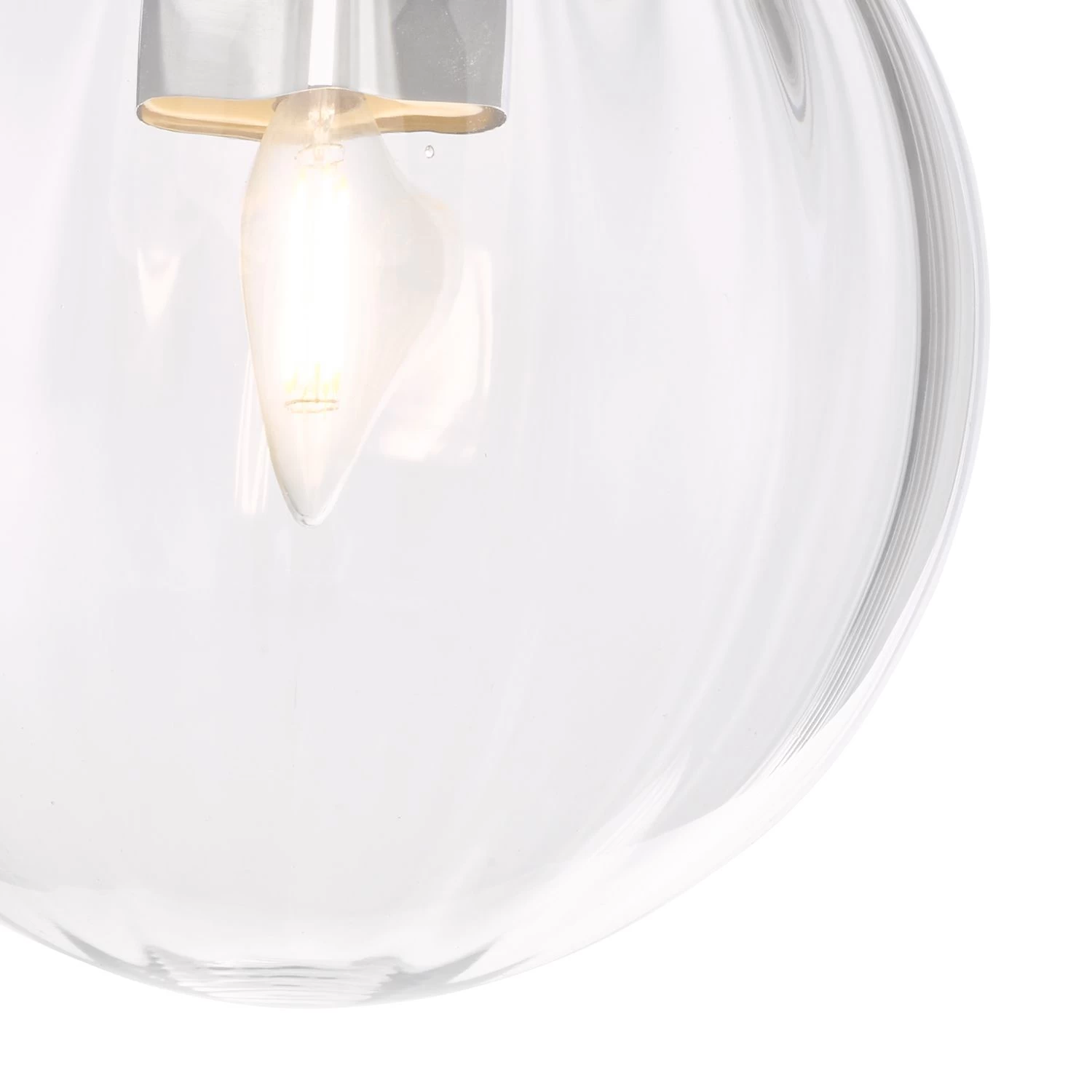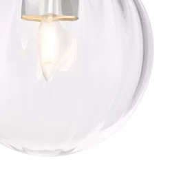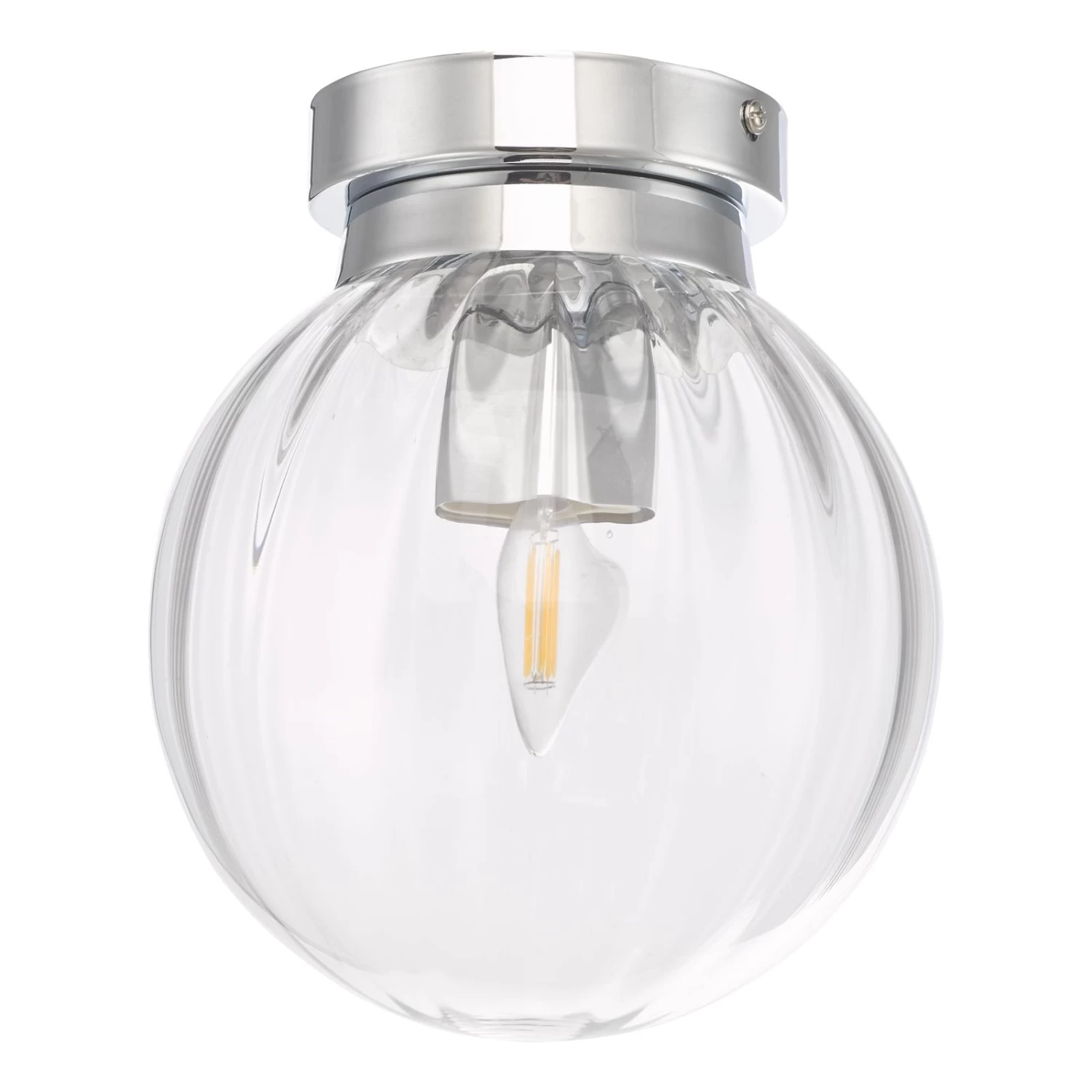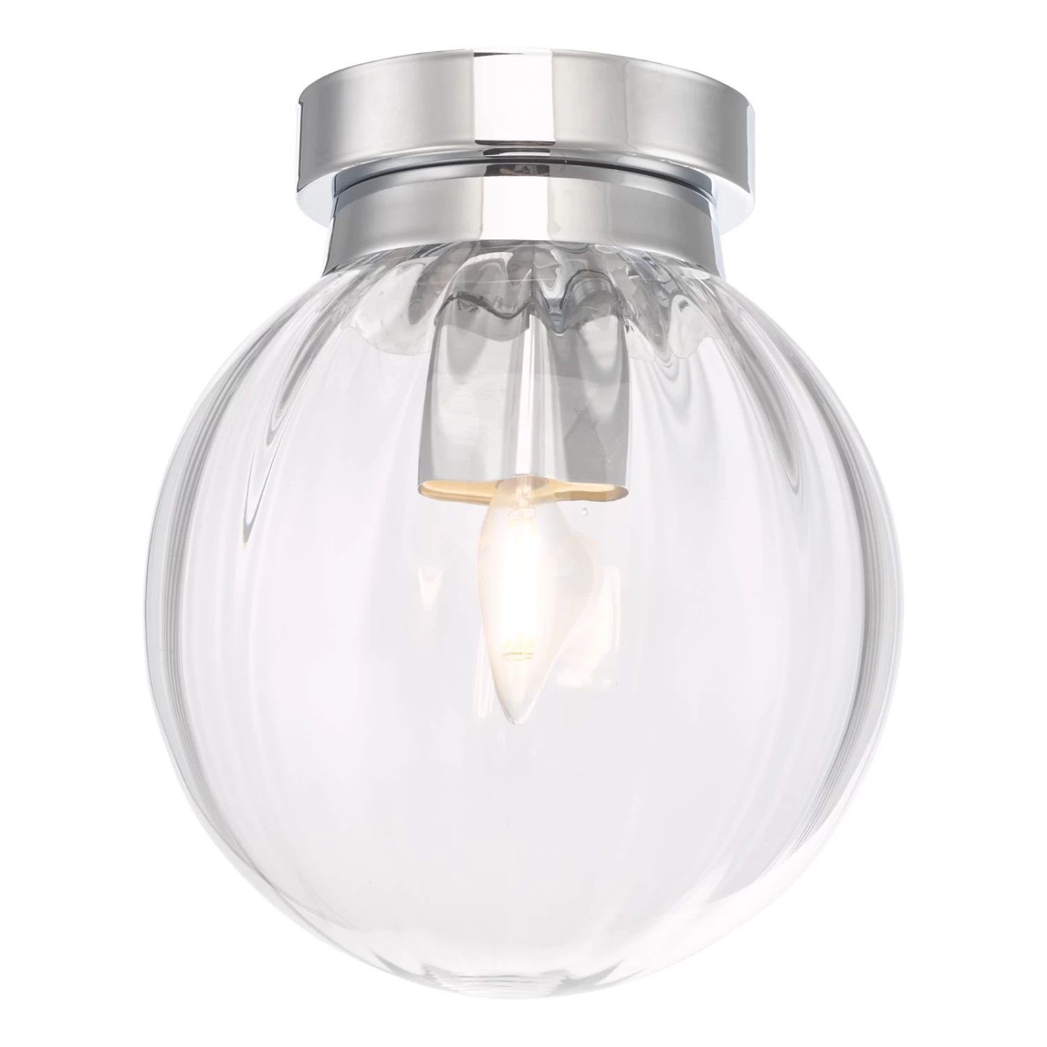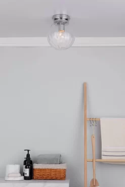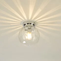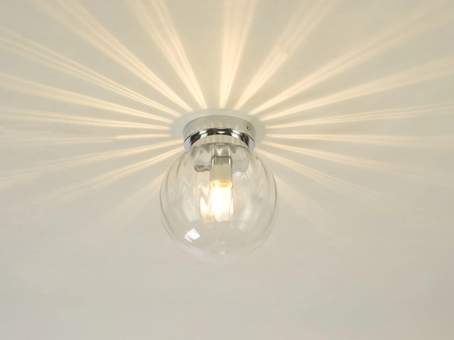 The KAVI bathroom flush with a round waterfall effect glass shade and polished chrome metalwork. The glass shade creates a spectacular lighting effect on the ceiling when on, displaying converging rays of light on the ceiling.