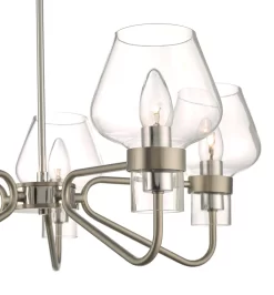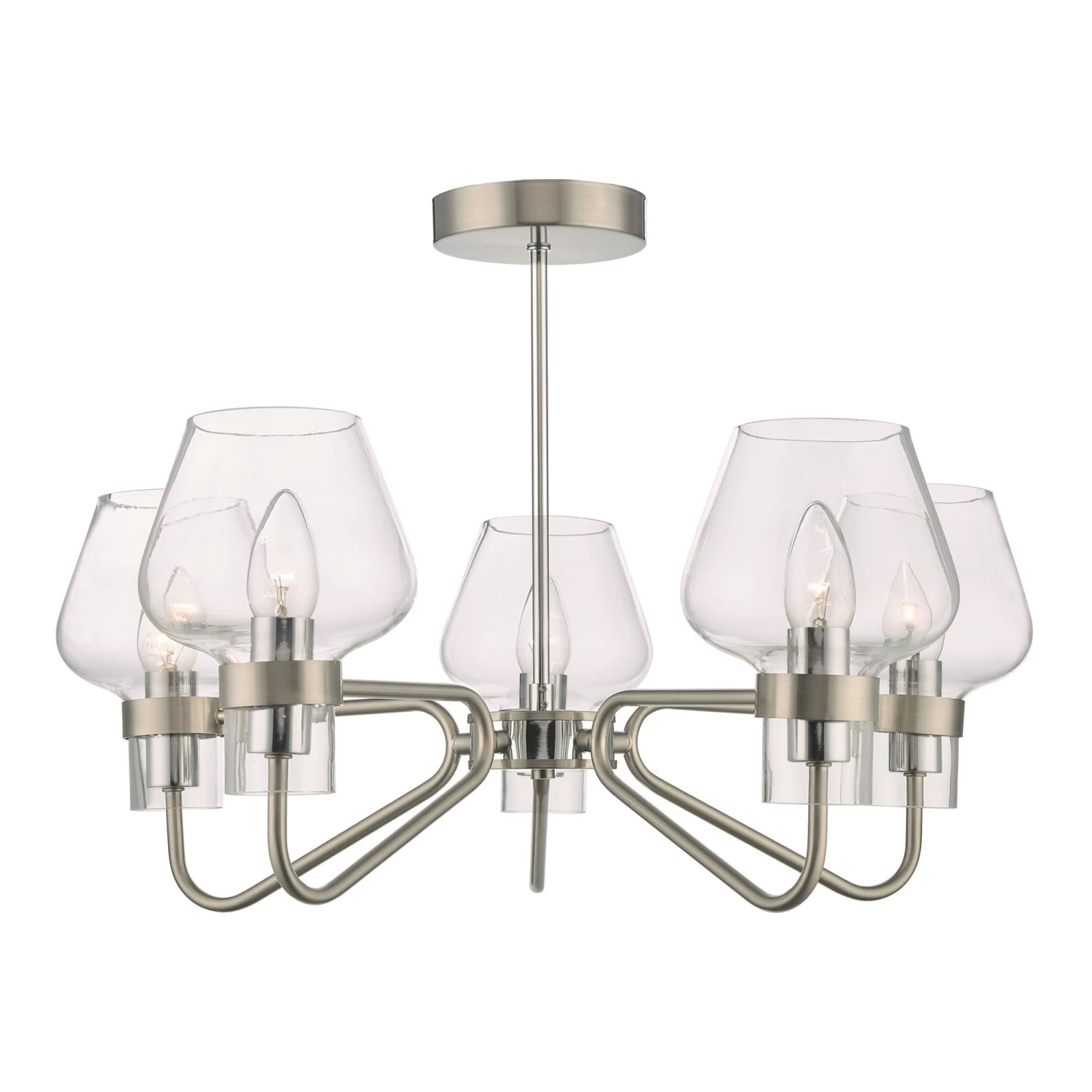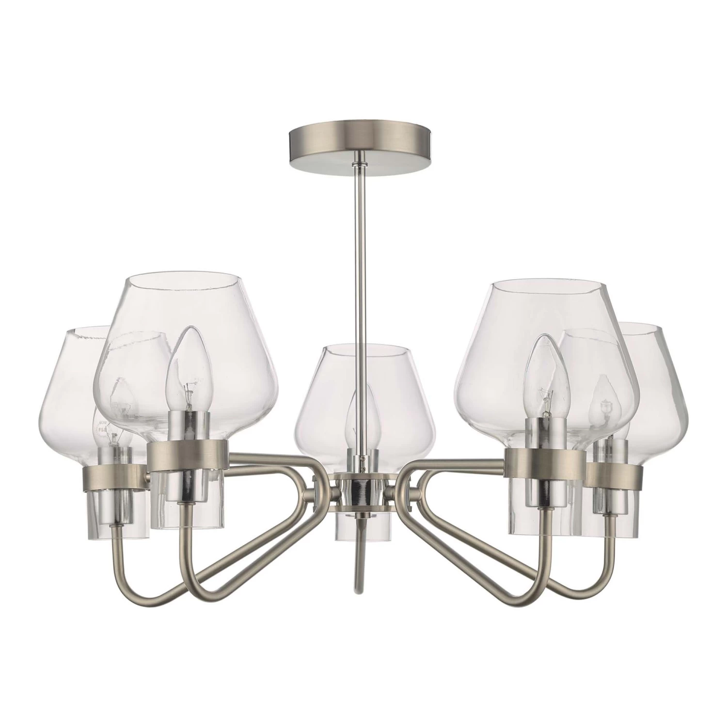 The Keta 5 light Pendant KET5446 is a semi flush ceiling light featuring glass shades with a retro look resting on a complementing satin chrome frame and glass. The KET0746 is part of our Keta range which also features a similarly styled wall light.