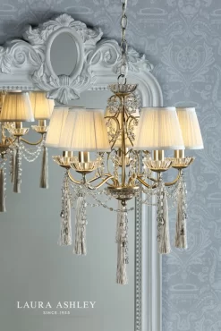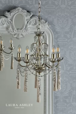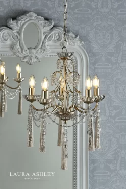 The ornate Aanais from Laura Ashley sparkles with vintage glamour and femininity, like a piece of jewellery for your home. Finished by hand, it is simply dripping – in true French chateau style – with hand-cut faceted drops and beads, swags of clear-cut glass crystals of varying shapes plus crystal drip dishes and oversized mink/cream tassels. These crystals are suspended from hooks on the opulent champagne finish painted metal frame, making it quite fun, as you can unhook the drops and individual chains to switch the look from time to time to suit your mood or the season; for a more flea market look, you could even add pieces of jewellery!