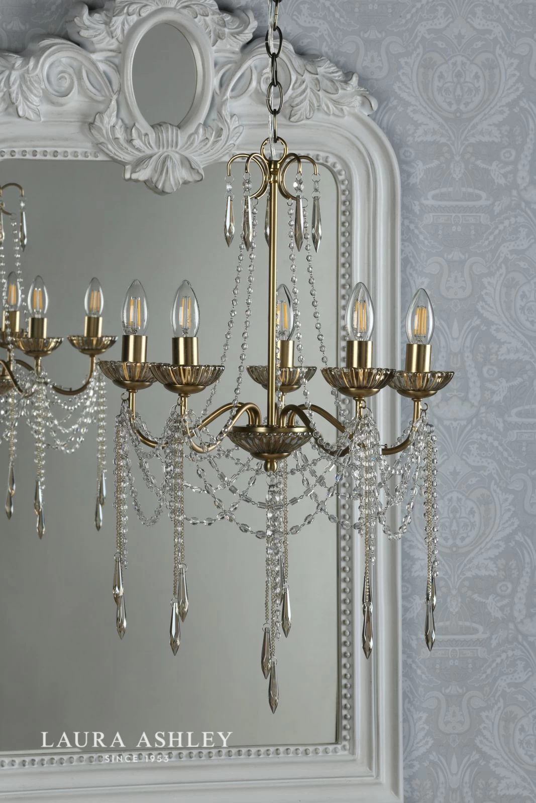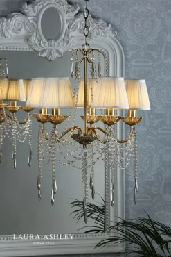 Everything a chandelier should be, the Aisling from Laura Ashley sparkles with French glamour and femininity, like a piece of jewellery for your home. Finished by hand, it is simply dripping – in true French chateau style – with hand-cut faceted drops and swags of crystal beads of varying shapes. These crystals are suspended from a warm antique brass finish frame.