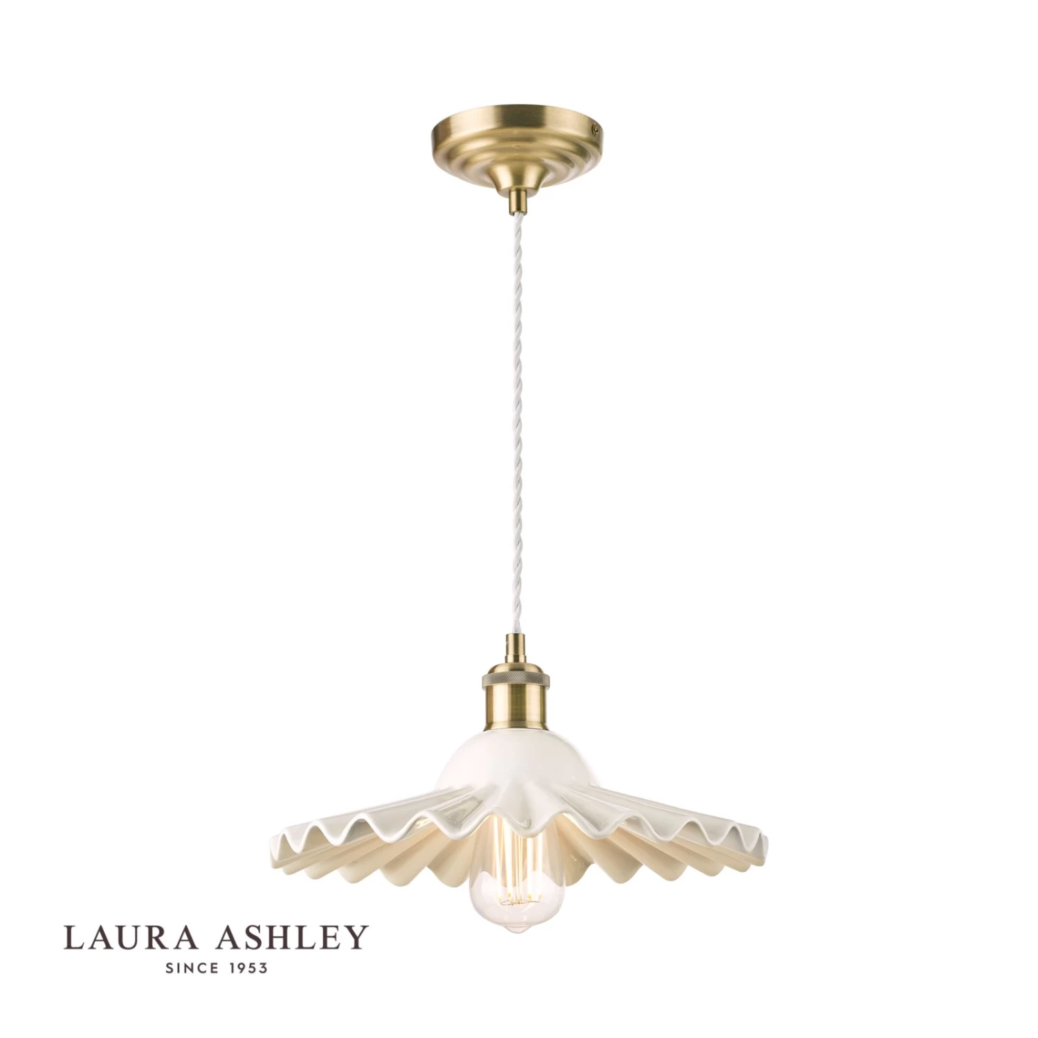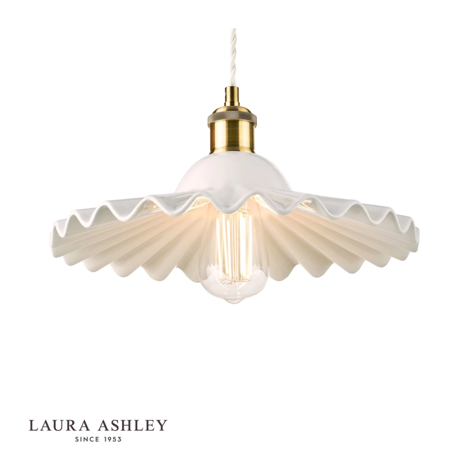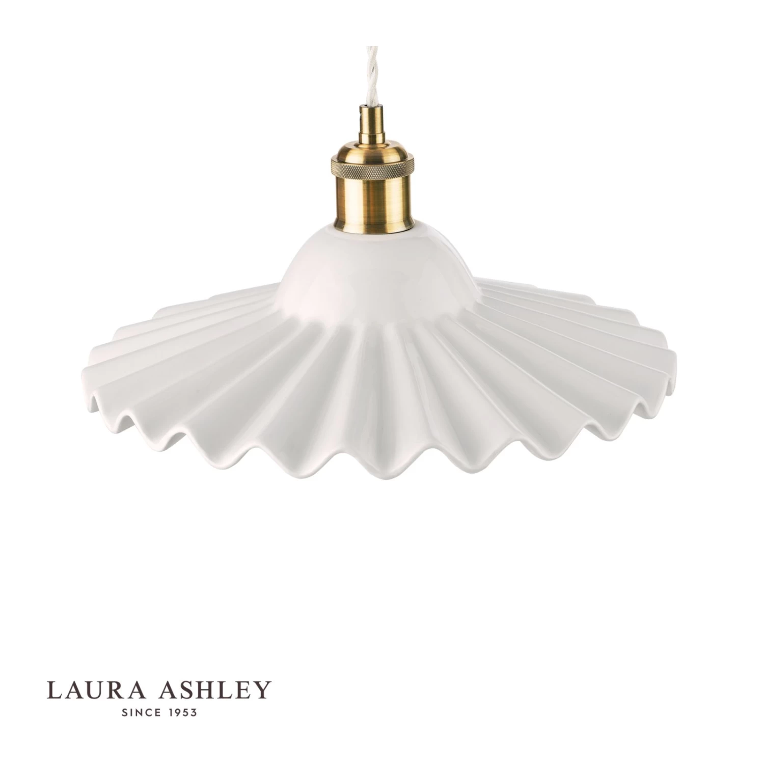With pretty ruffled edges like a pie crust or dancer’s skirt, the Beca pendant ceiling light is a delight. This charming pendant shade is made of thick ceramic with a white gloss glazed finish. Also reminiscent of the undulations on a clam shell, the Beca is teamed with fittings in antique brass and a matching flat round ceiling rose. Upon fitting, you can adjust the length of the cream twisted braided-fabric feature cable to alter the height to suit your space (18–100cm); it is suitable for lower ceilings.