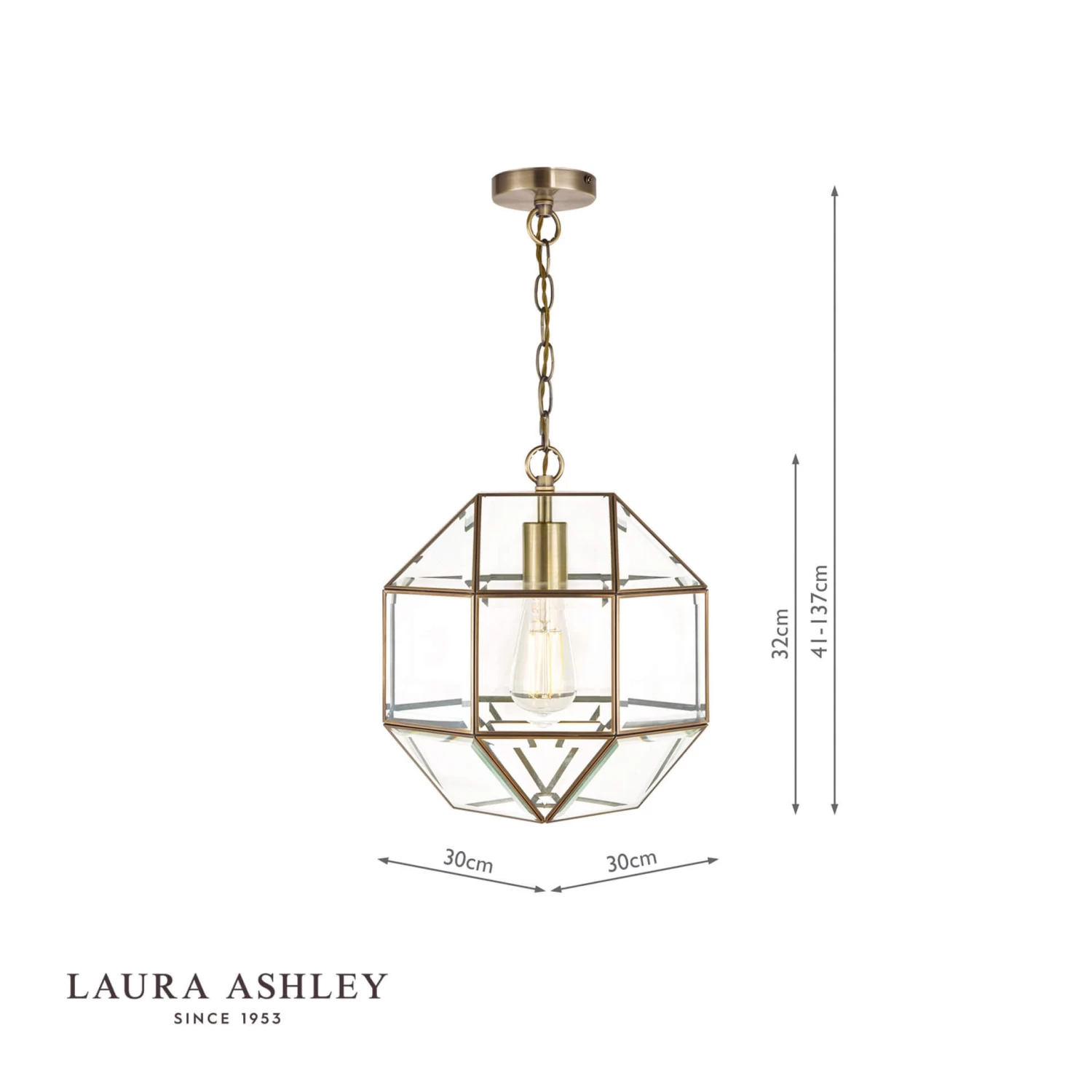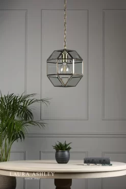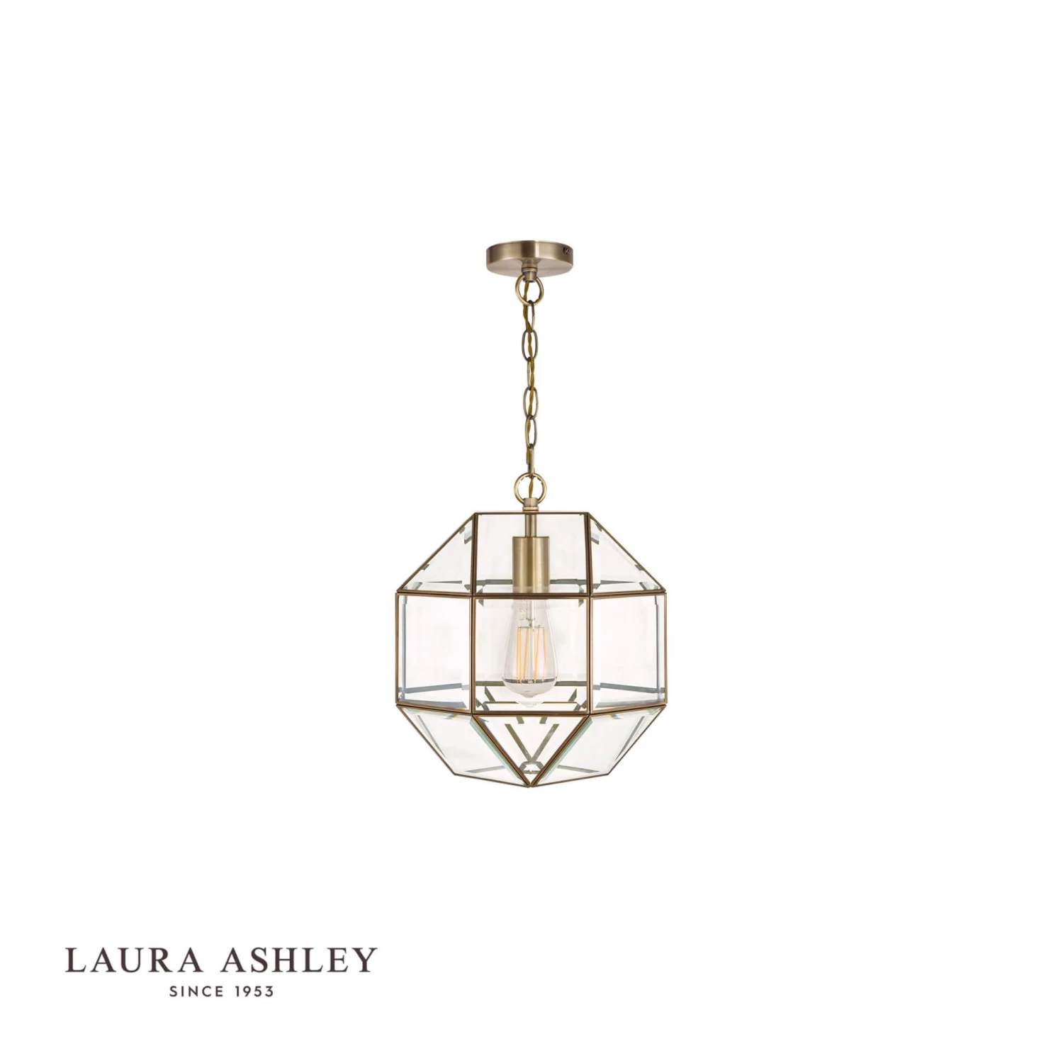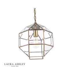 This glazed ceiling pendant lantern-style light from iconic brand Laura Ashley will be a real feature in your hallway or living room. The Blackwell ceiling light comprises small panels of clear glass, the edges of which are encased in thin metal strip, with a warm, antique brass finish, forming a three-dimensional roughly globe shape. The glass is bevelled for a luxurious, quality look. Suspended by a chain, the height of this light can be adjusted when it is installed, to give an overall drop of between 41cm and 137cm. Chain, ceiling rose and twisted braided gold cable are included. Takes 1 x 60W max ES GLS light bulb (not included).
