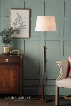 The Burdale Floor Lamp by Laura Ashley is classic style floor light, the hand-finished design will elevate your space. Made of ash wood, with a square base, and a dark stain to match our Dark Chestnut Garrat furniture range. This lamp has a antique brass metal details and an adjustable height. Base only; we recommend a 40cm shade – for a timeless look, why not try the Laura Ashley Fenn Silk shade or, for a contemporary look, try the Bacall Linen shade? This product has a twisted cable with a convenient push-bar switch.Bulb not included; takes 1 x 60W max BC GLS.