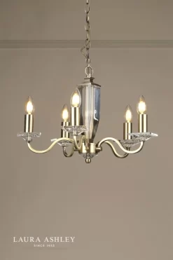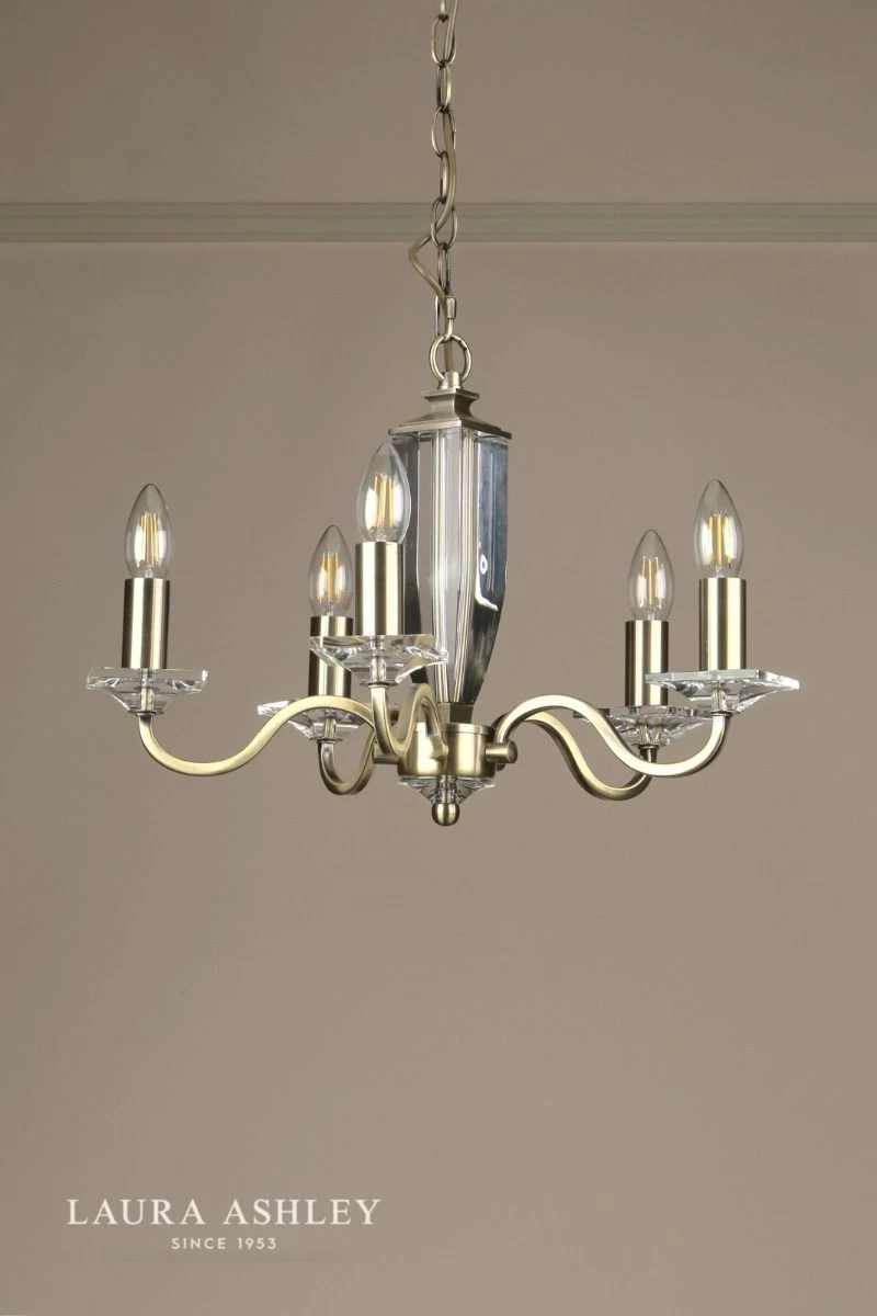 The Laura Ashley Carson 5-armed ceiling fitting is a beautifully crafted, candelabra style chandelier that makes a rather grand statement. Five arms in a warm antique brass finish curve out from the column-shaped body. Reminiscent of the shape of a slender classical vase, this centre piece is in clear, cut crystal, hand polished to give a smooth surface. The crystal is also used for the square candle dishes.