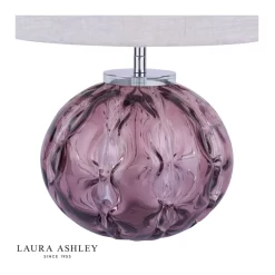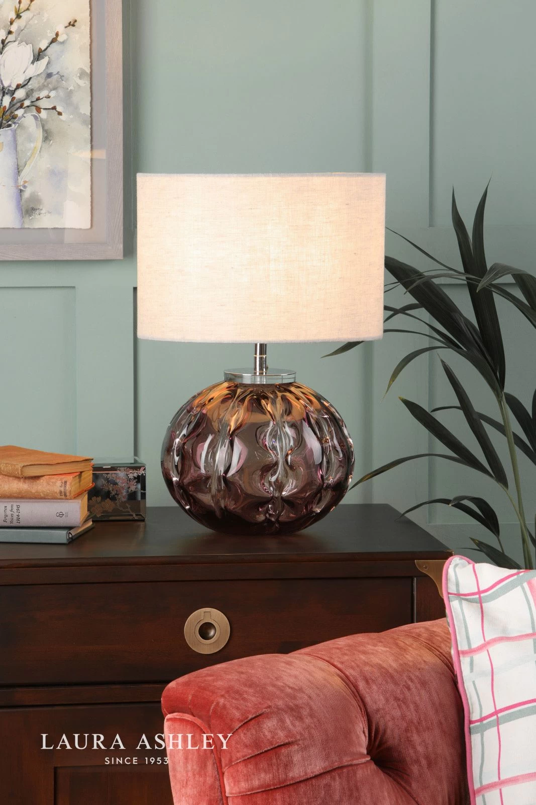 The Elderdale Table Lamp by Laura Ashley features rippled artisan style glass with a pink tint, paired with grey shade. This statement table lamp will complement any room. Colour and pattern variations are to be expected, so each lamp in your home will be unique. This light has an in line Switch on the grey fabic cable. Bulb not included; takes 1 x 60W Max ES GLS.