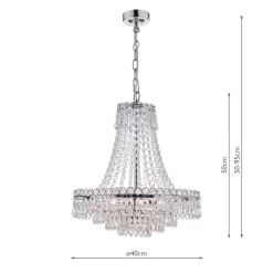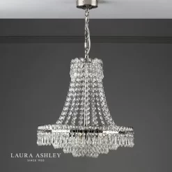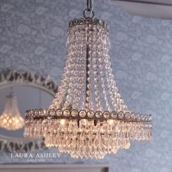 Discover classic elegance with Laura Ashley’s Enid Chandelier. Delicate crystals hang from rings to form this beautiful pendant, an eye-catching centrepiece that is an effortlessly sophisticated lighting option that is always in style. With a cascade of crystal beads flowing downwards and outwards from a narrow circlet to a wider one, from which are suspended cut droplets in ever-decreasing circles, this French-influenced ceiling light is made of clear, cut crystal, hand polished to give a smooth surface, on a metal frame finished with polished nickel.