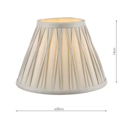 The Laura Ashley Fenn lightshade has a classic, slightly angled, Empire drum form. The diameter of this size is 20cm. Here we finish it in an elegant, pinched pleat smooth silk in silver.