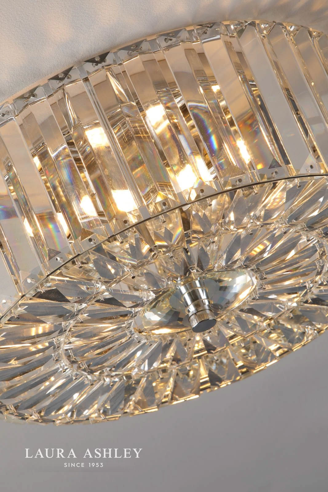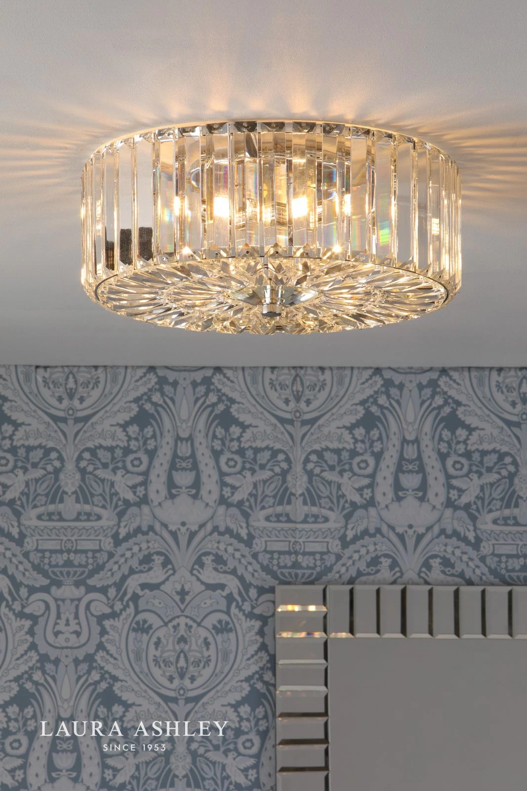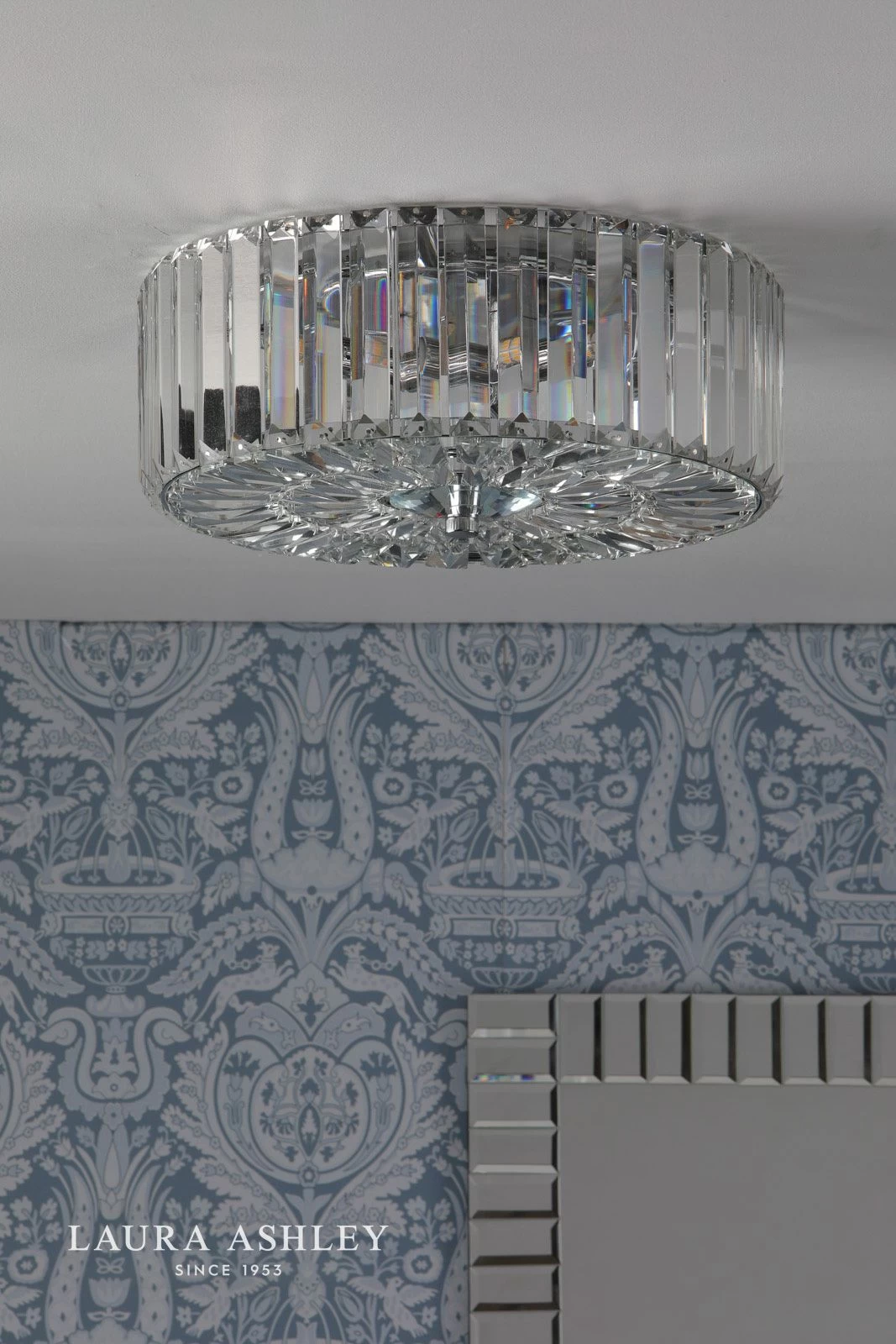The glamorous Fernhurst ceiling light by Laura Ashley features bevelled glass rods, all suspended from a circular frame in bright polished chrome. Full flush fittings attach directly to the ceiling so are suitable for low ceilings and small rooms, plus they have a neat finish with no visible cables. Bulbs not included; takes 3 x 33W Max G9.