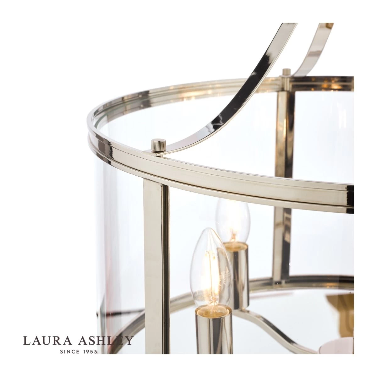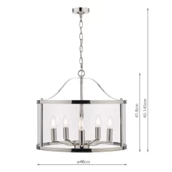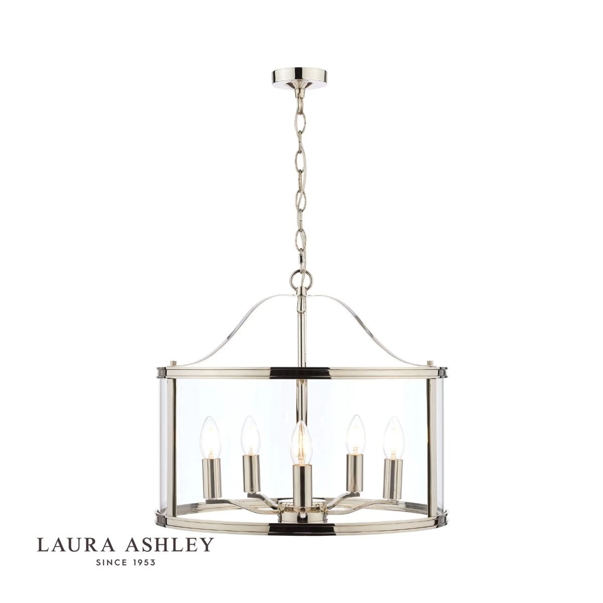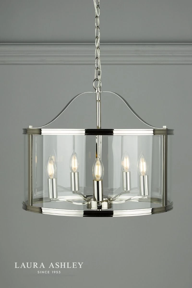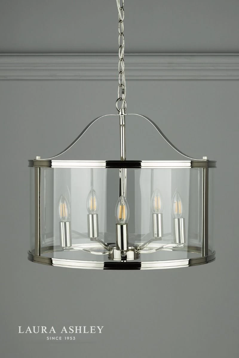 The clean-lined Laura Ashley Harrington ceiling pendant light is a graceful blend of clear glass and sleek metal. A simple, lantern-style drum-shaped case surrounds a suspended quintet of lampholders, all in a vintage polished nickel finish for effortlessly elegant looks. The 5 light Harrington ceiling pendant is a subtle yet stylish piece to illuminate your favourite room and create a bright, inviting space.