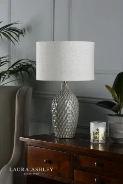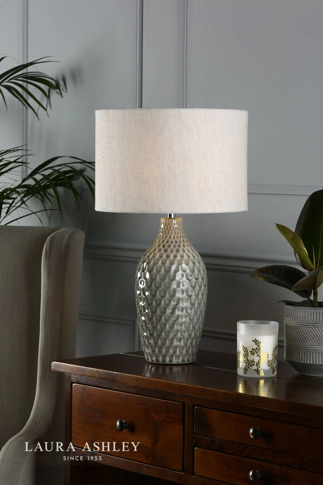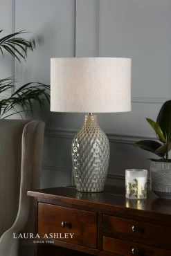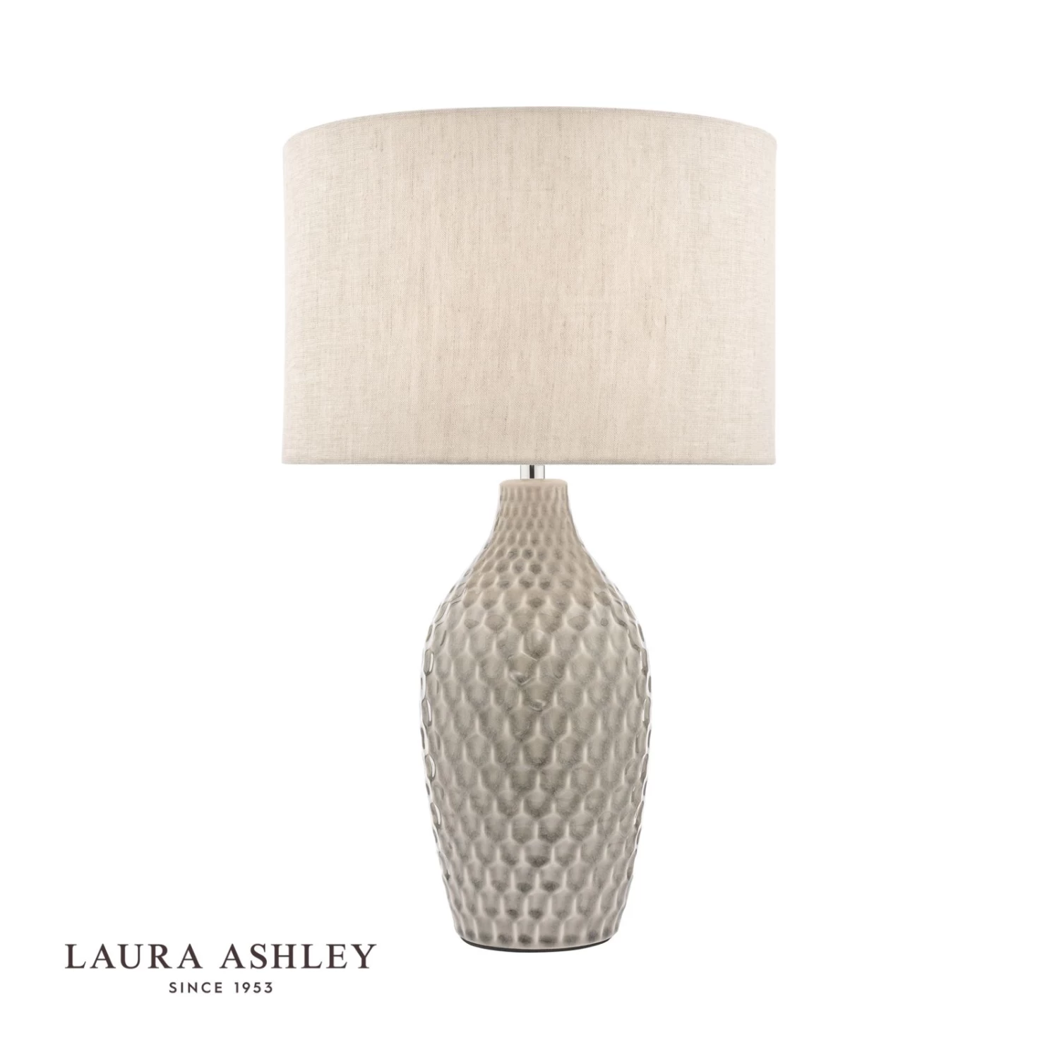 Designed especially for Laura Ashley, the Heathfield table lamp is a complete lamp for upstairs as well as down. It features a beautifully tactile ‘honeycomb’ texture on a traditional and simple bottle shape base, with a crackle glaze for an aged effect in a versatile neutral grey. Complete with a complementary natural linen cylinder shade, the Heathfield is a lovely lamp for introducing texture into a room. Easy to live with, it will sit nicely on a side table or hall console.