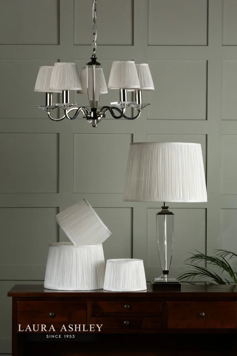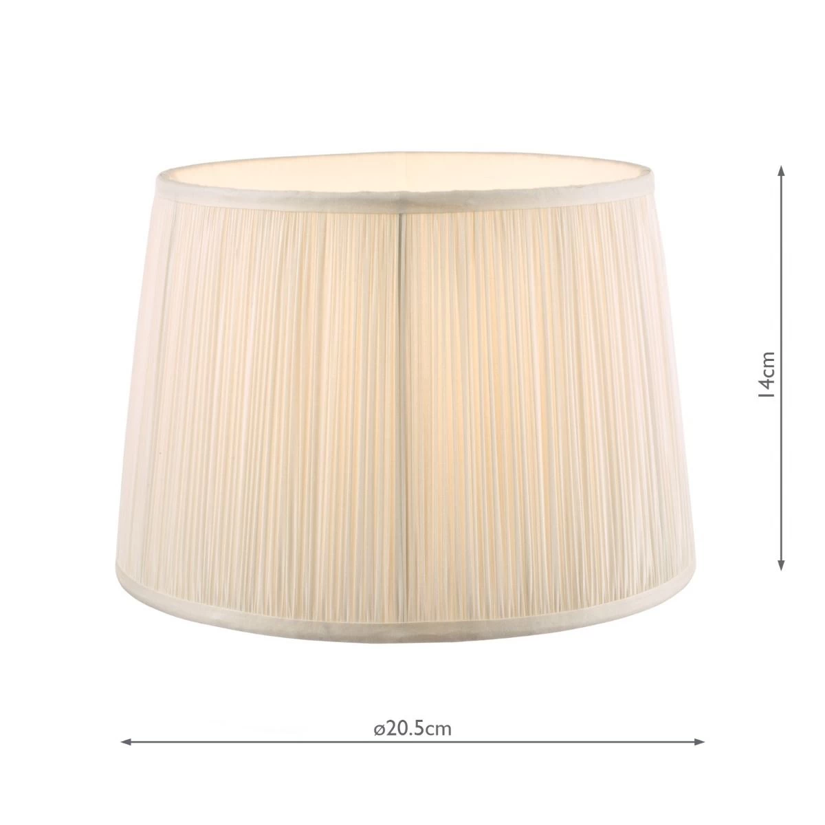 The Laura Ashley Hemsley lightshade has a classic, slightly angled, Empire drum form. The diameter of this size is 20cm. Here we finish it in an elegant, pleated smooth silk in cream.