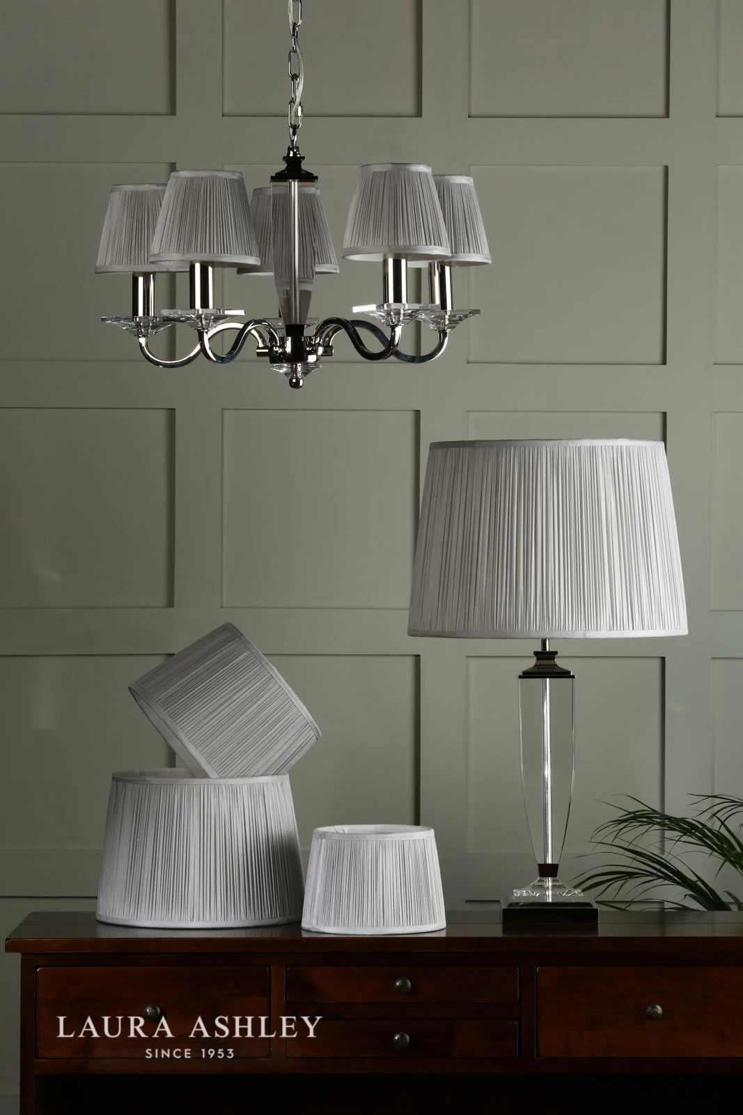 The Laura Ashley Hemsley lightshade has a classic Empire tapered drum form in an elegant, pleated smooth silk. Now also available in warm colours for cooler months – why not ring the changes with a quick switch of shades each season? Fabric shade only; fitting not included. 13cm candle shade 25W max; clips easily on to a candle light bulb. 40cm (shade for floor lamps and larger table lamps 60W max; has a reversible gimble to fit ceiling light suspensions. Other sizes 40W max; suitable for E27 fittings; comes with a reducer ring to fit traditional B22 fittings.