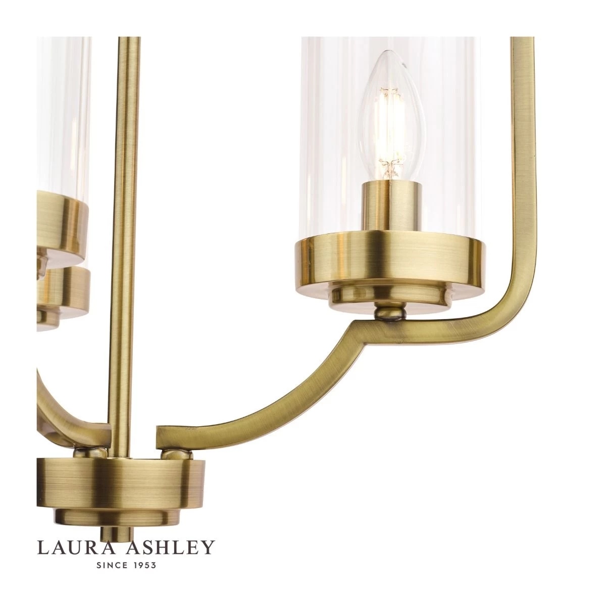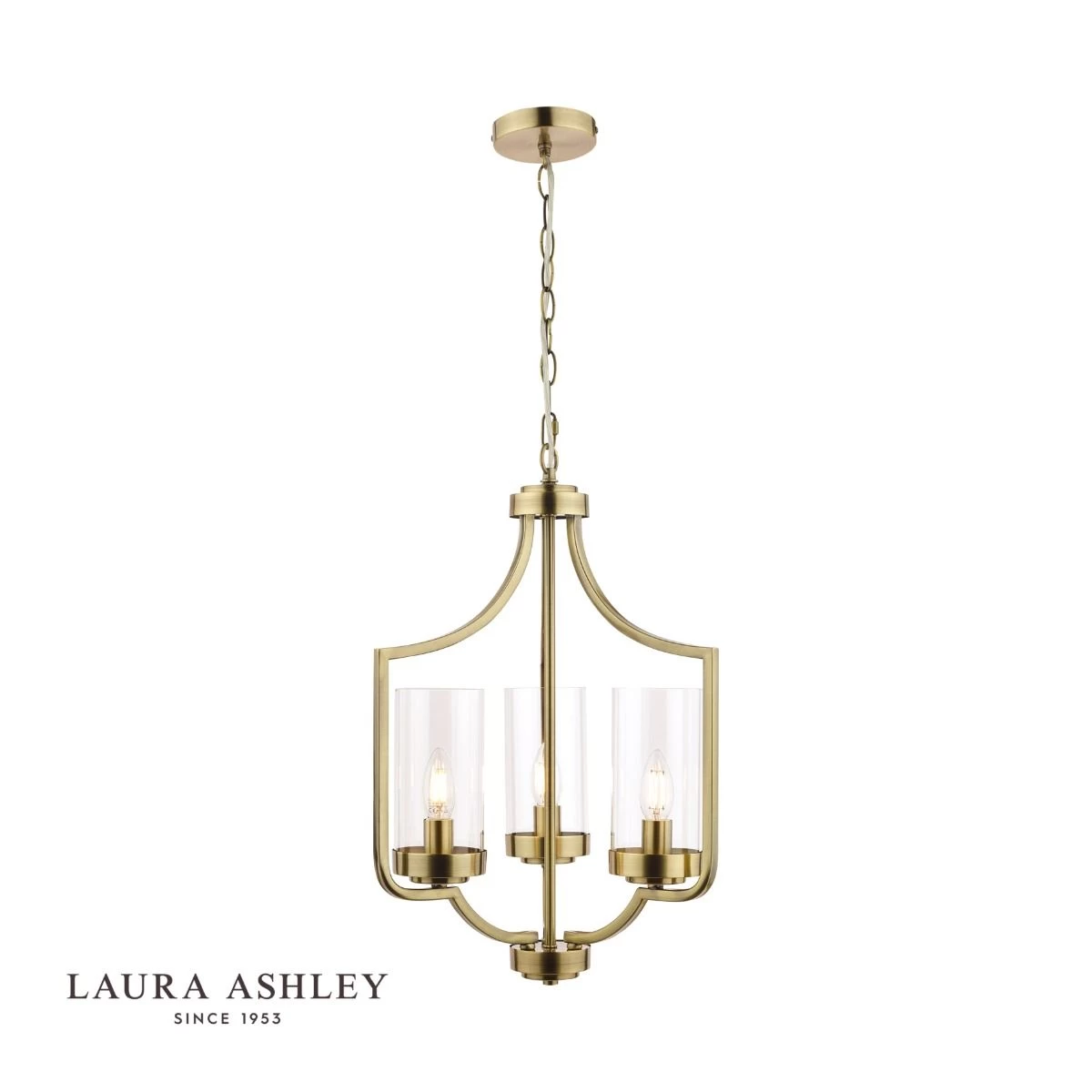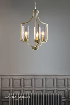 The Joseph chandelier from Laura Ashley was inspired by the draped form of a Moroccan tent. This unusual chandelier has three individual lampholders, each supporting a clear glass cylinder shade, held on arms that continue upwards to form an open lantern-style framework. It is finished in warm antique brass.