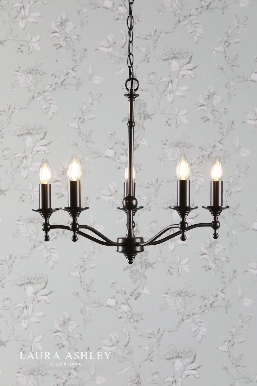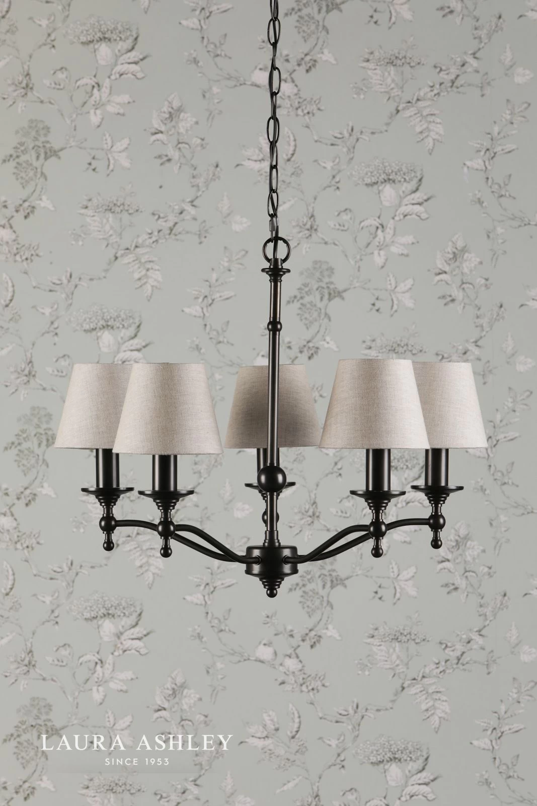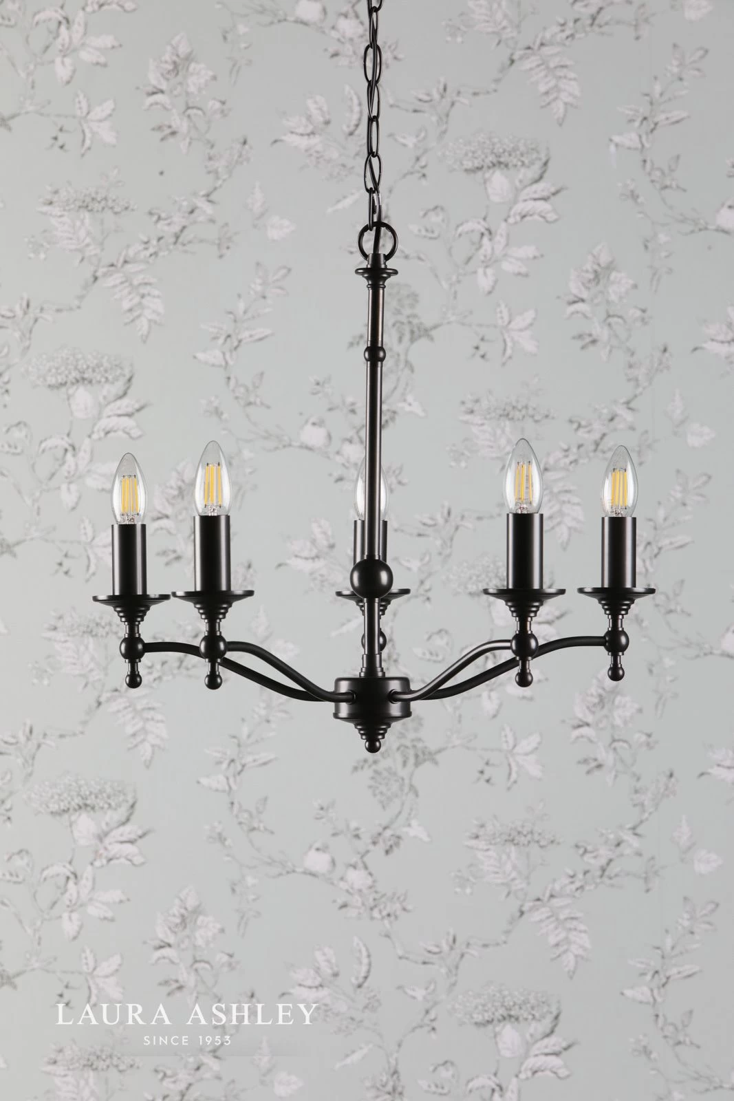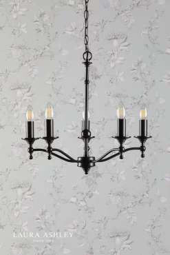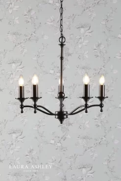 The Ludchurch 5 Light Chandelier by Laura Ashley is a timeless classic candelabra style with a luxury black plated finish. You can adjust the drop to suit the height of your ceiling. Add one of our 5″ candle clip shades for a softer look. Bulbs not included; takes 5 x 40W Max SES.