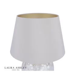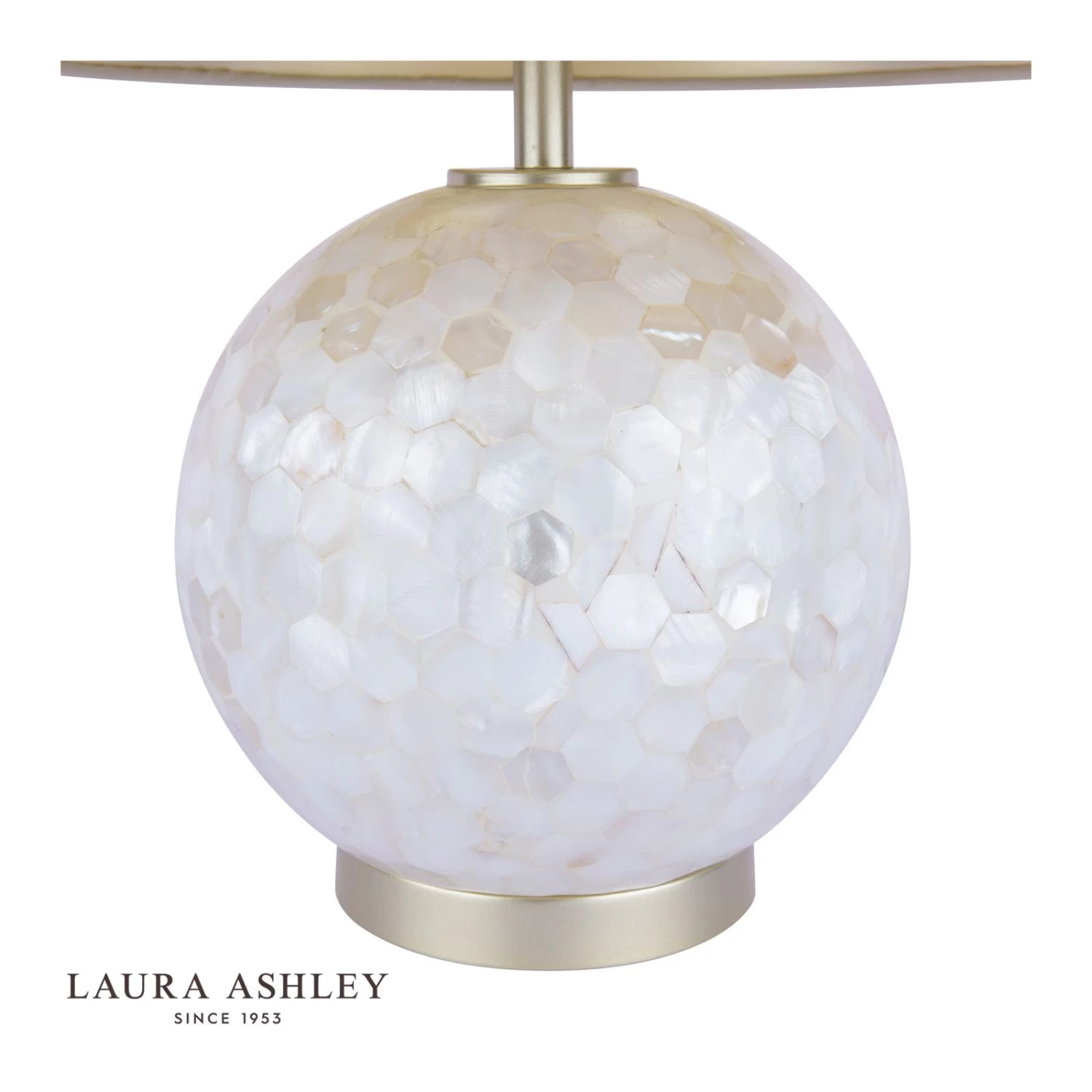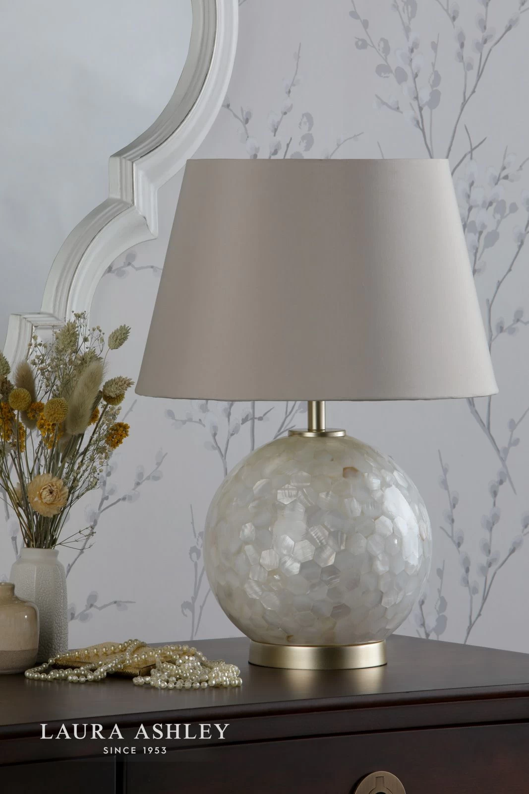 The Mathern Table Lamp by Laura Ashley is hand made with mother of pearl expertly cut into hexagonal shapes to create a unique piece. The champagne gold finished metal complements the natural tones on the mother of pearl perfectly. Paired with an Ivory faux silk tapered drum lamp shade with a soft gold lining. Colour and pattern variations are to be expected, so each lamp in your home will be unique. This product has a clear cable with an inline switch. Bulb not included; takes 1 x 40W max SES GLS.