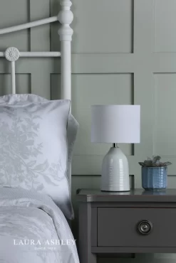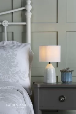 This pair of pretty little table lamps is the perfect set for the bedroom or a long console or dresser. In a simple bottle shape, each comes complete with a neutral ivory linen shade. The neutral grey-cream glaze has a very subtle crackle glaze effect. With hand-carved horizontal ribbing, these are nicely tactile lamps which are sure to find a purpose in your home.
