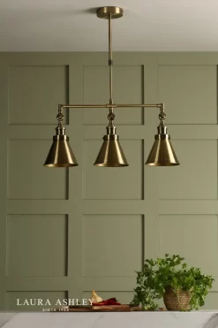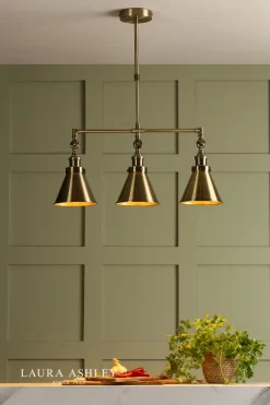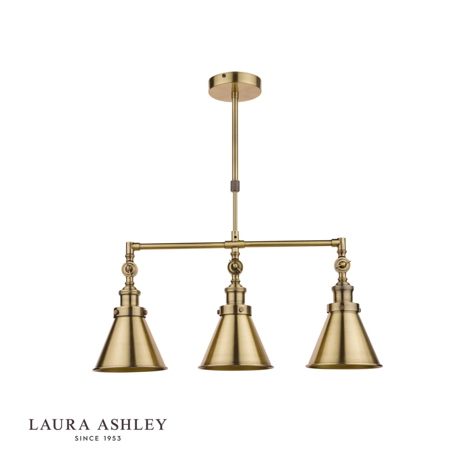 From iconic brand Laura Ashley, the Rufus triple light bar pendant will look superb in your kitchen or dining room, suspended low over a table or kitchen island. This is a quality bar ceiling light with cone shades of spun metal with a neat rolled edge, suspended from a slim, rectangular ceiling plate. The solid shades direct light downwards onto the surface below, not only creating great illumination but enhancing the atmosphere when surrounding lights are turned down. The height of this light can be adjusted when it is installed, to give an overall drop of between 27cm and 127cm. Comes with a twisted, light brown braided fabric cord for a vintage character look. Takes 3 x 60W max ES golfball light bulbs (not included).