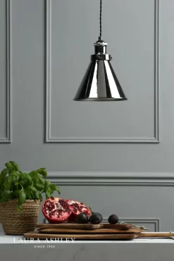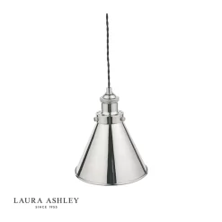 In an attractive combination of vintage, industrial and country charm, Laura Ashley’s Rufus single light pendant fits effortlessly into kitchens and living rooms. Bold lines and angular shapes lend a sophisticated, contemporary touch that looks fantastic against bare brickwork. This contemporary hanging ceiling light boasts industrial appeal with a cone-shaped metal shade and matching fittings with engineered detailing in a quality finish. Height adjustable to suit your space, it looks fantastic above a dining table, low over a task area, or in a line of three or five over an bar or island, and of course is brilliant for the higher-ceilinged room. Choose a finish to accessorise your kitchen or diner, perhaps matching other fittings such as door handles. Height is adjustable at the point of installation (24–124cm). Takes 1 x 40W max ES GLS (not included).