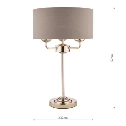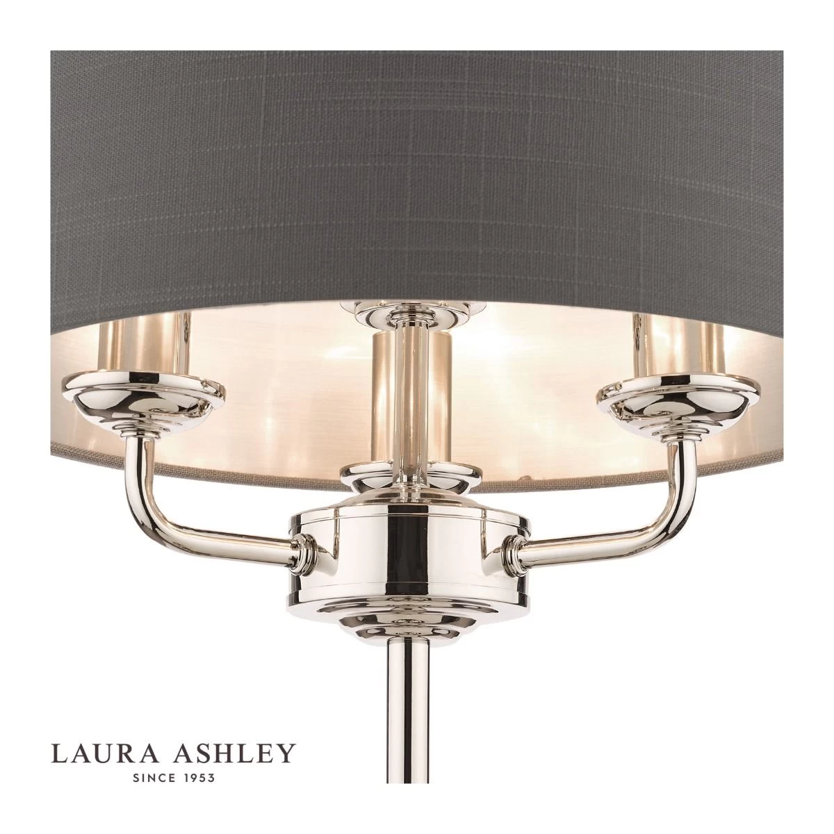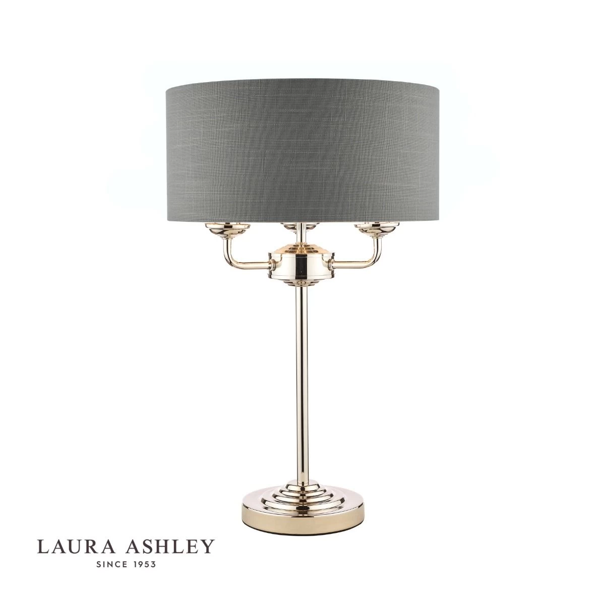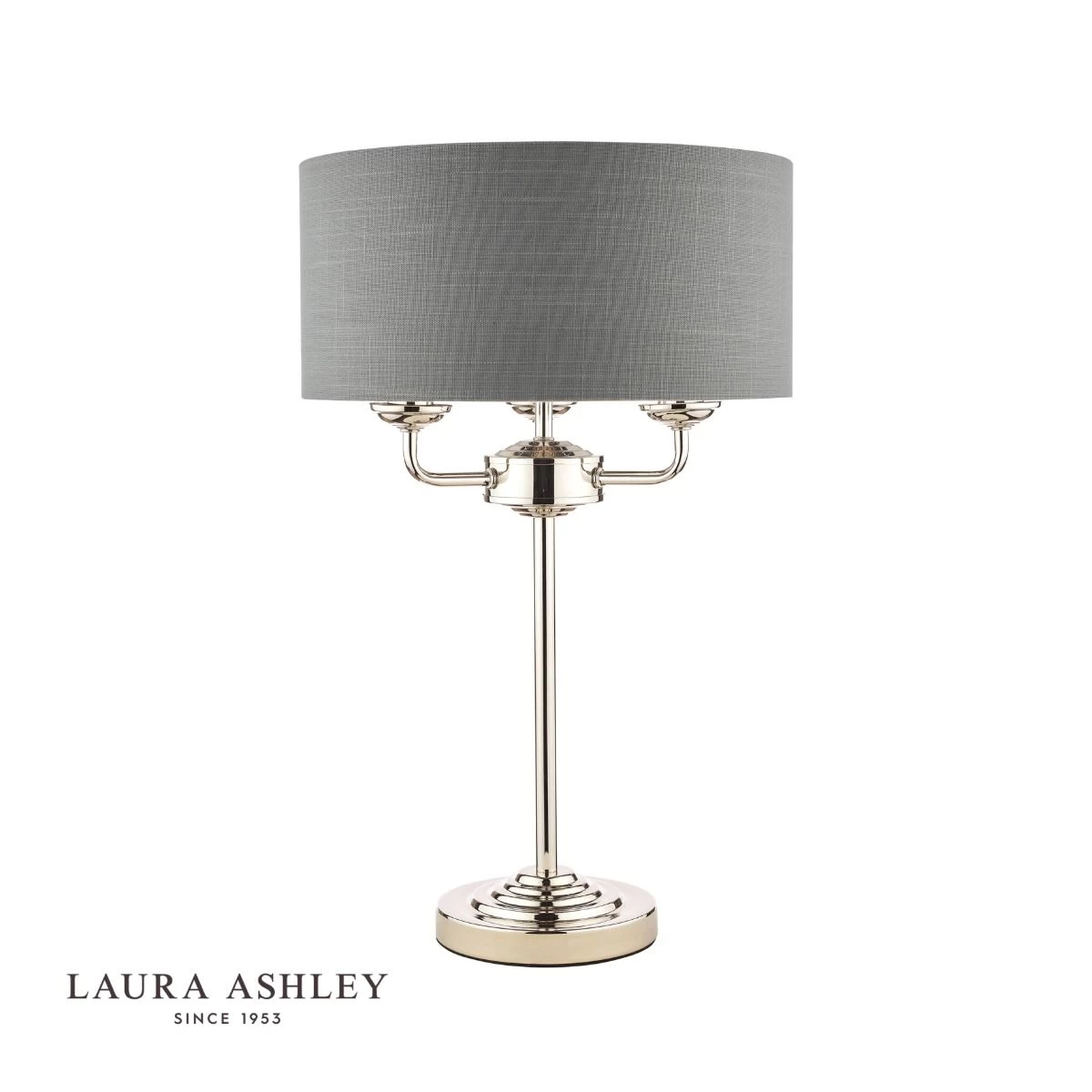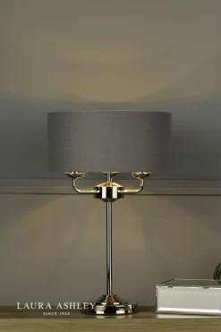 Chic and on-trend, the attractive Sorrento table light from Laura Ashley boasts three lights on arms, all encased in a single contemporary drum shade in charcoal grey slubbed linen with a metallic silver inner. A straight stem rises up from a round, Art Deco style, stepped base. This triple light table lamp comes in a modern polished nickel finish, adding grown-up atmosphere to your dining or living area.