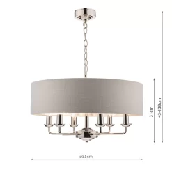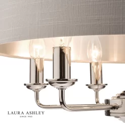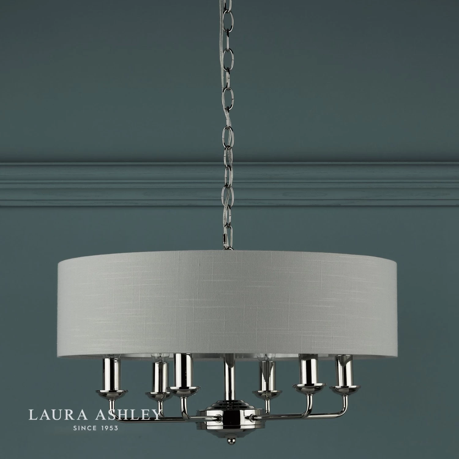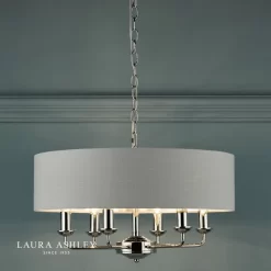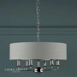 Cool and smart, the attractive large Sorrento ceiling light from Laura Ashley boasts six lights on arms, all encased in a single contemporary drum shade in silver slubbed linen with a metallic silver inner. A hanging chain falls from a round, Art Deco style, stepped ceiling rose. This 6 light pendant ceiling fitting comes in a velvety brushed chrome, adding grown-up atmosphere to your dining or living area.