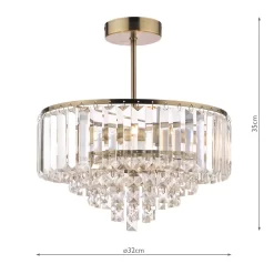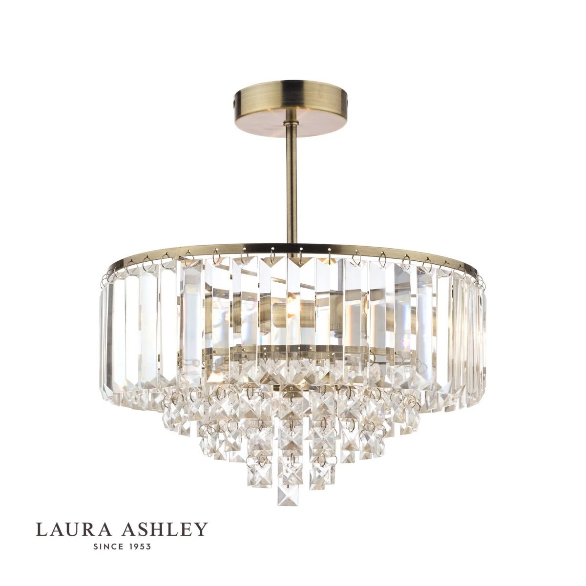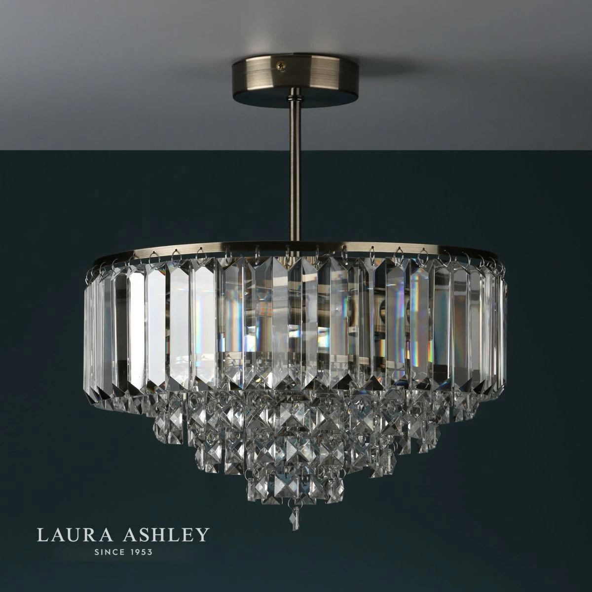 The glamorous Laura Ashley 3 light Vienna ceiling light features bevelled glass ‘coffin crystal’ rods with a glittering fountain of square-cut faceted glass droplets that fall to a central point, all suspended from a circular frame in a warm antique brass finish. Semi flush fittings are popular as they sit closer to the ceiling than a pendant so are suitable for lower ceilings and smaller rooms, plus they are more decorative and have a neater finish – there are no cables on show as the stem attaches directly to the ceiling rose.