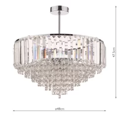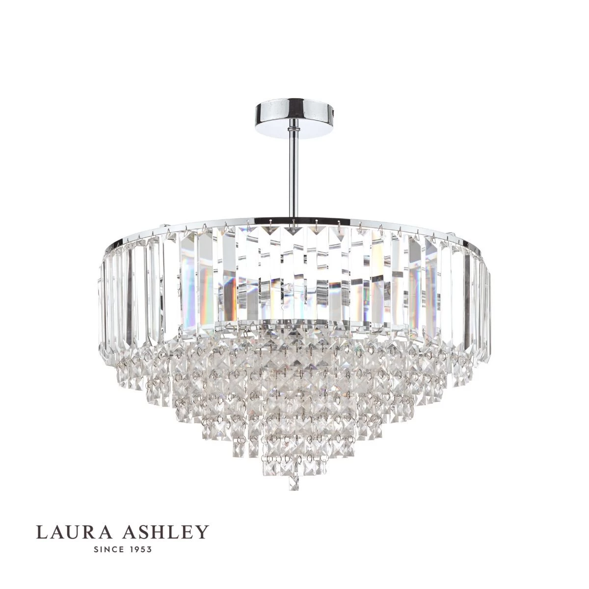 The glamorous Laura Ashley 5 light Vienna ceiling light features bevelled glass ‘coffin crystal’ rods with a glittering fountain of square-cut faceted glass droplets that fall to a central point, all suspended from a circular frame in a bright, polished chrome finish. Semi flush fittings are popular as they sit closer to the ceiling than a pendant so are suitable for lower ceilings and smaller rooms, plus they are more decorative and have a neater finish – there are no cables on show as the stem attaches directly to the ceiling rose.