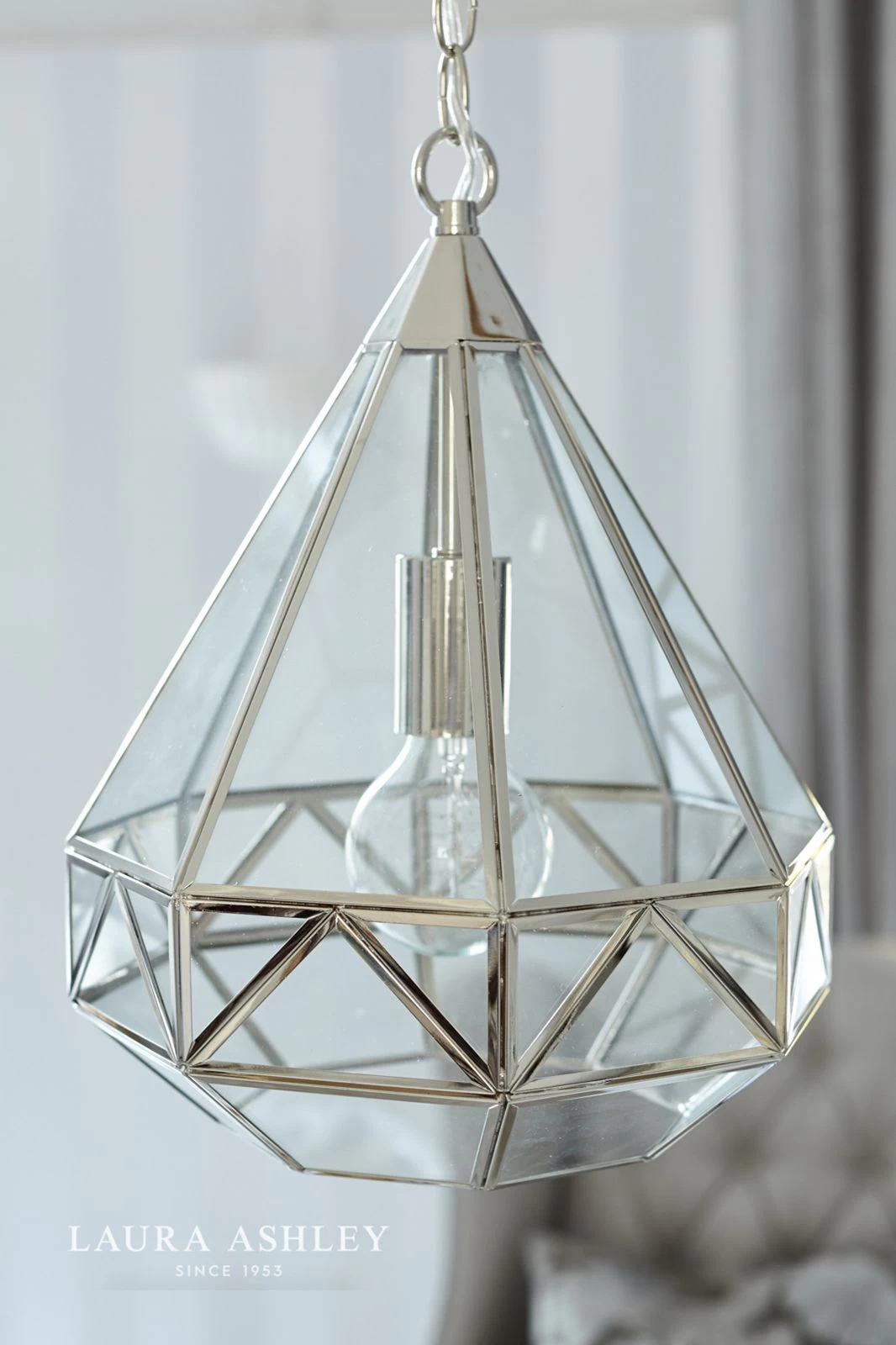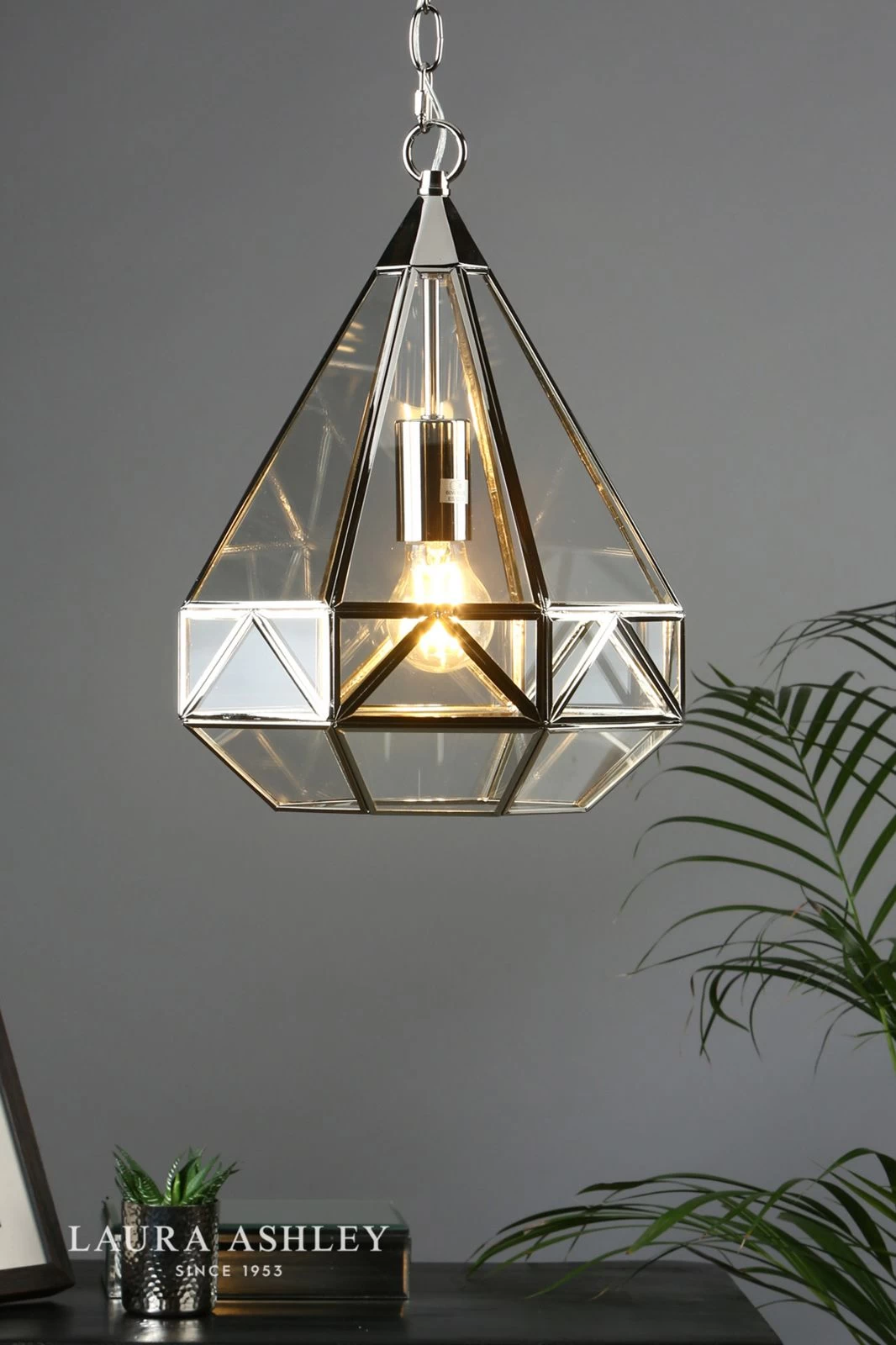 A thoroughly modern, lantern-style ceiling pendant, the Zaria from Laura Ashley features a geometric glass frame with a timeless polished silver finish, allowing it to slip seamlessly into any number of interior schemes.