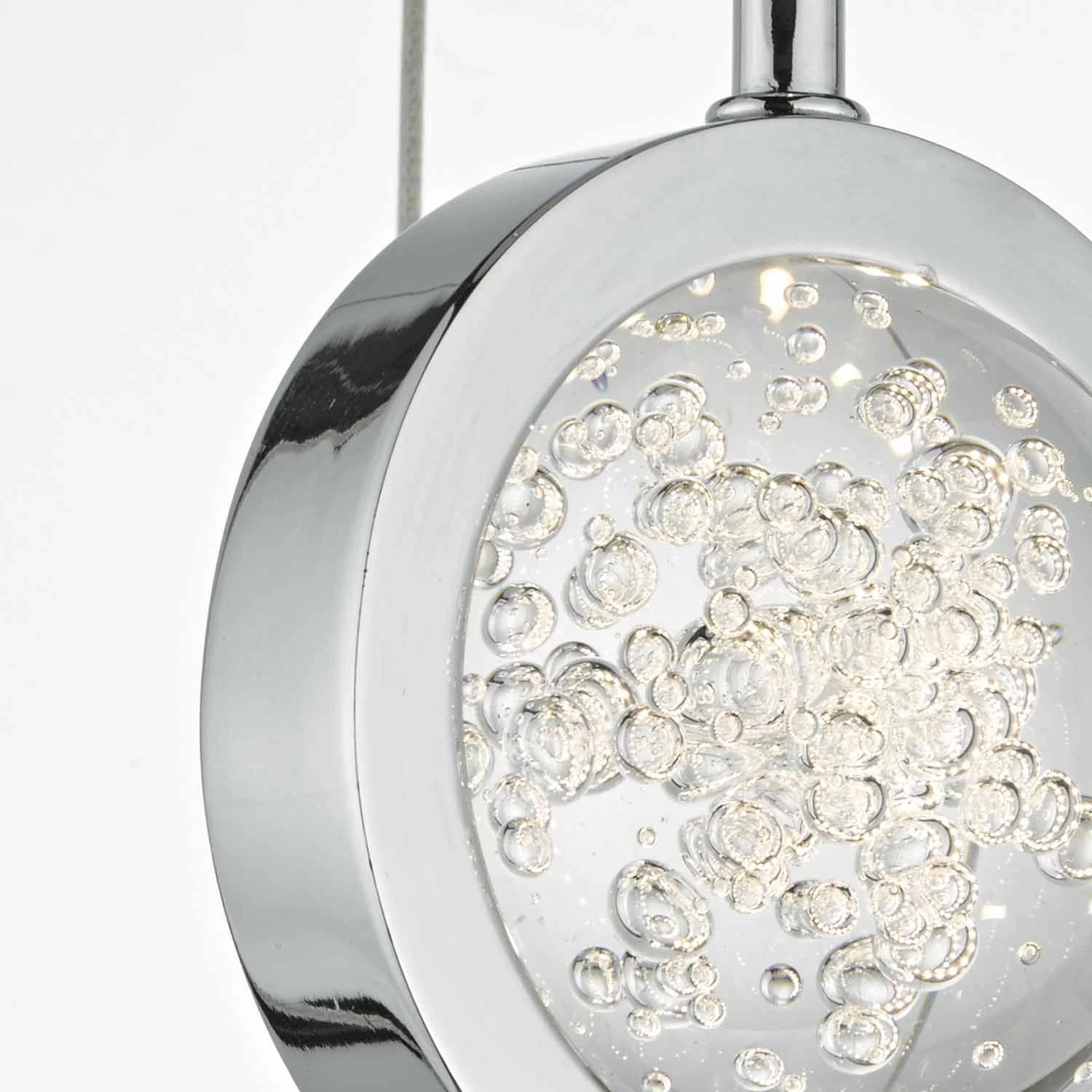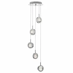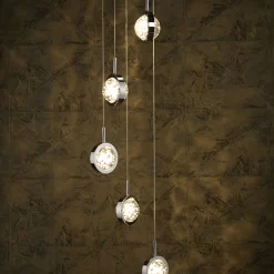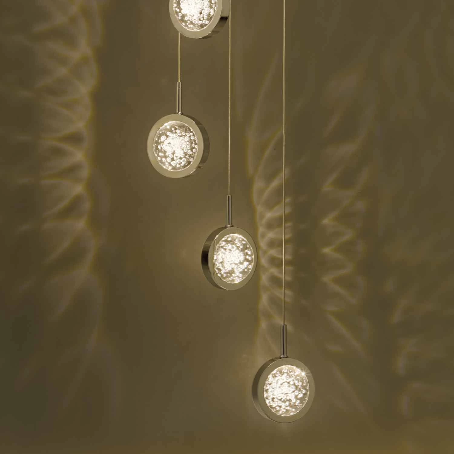 The LIVIA is a spiral cluster of highly polished nickel with spheres of bubble infused glass lit by hidden LEDs to create a unique effect. The latest LED technology ensures that the light output is suitable to fill a room whilst using minimal energy. Height adjustable on installation.
