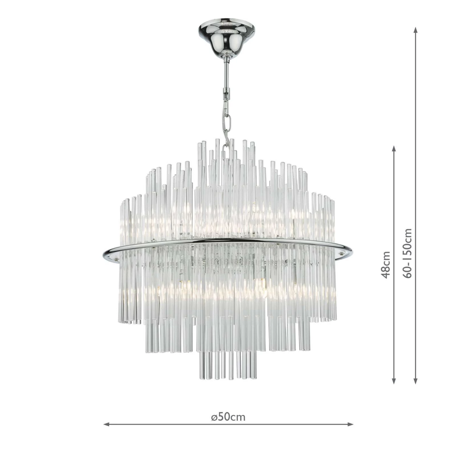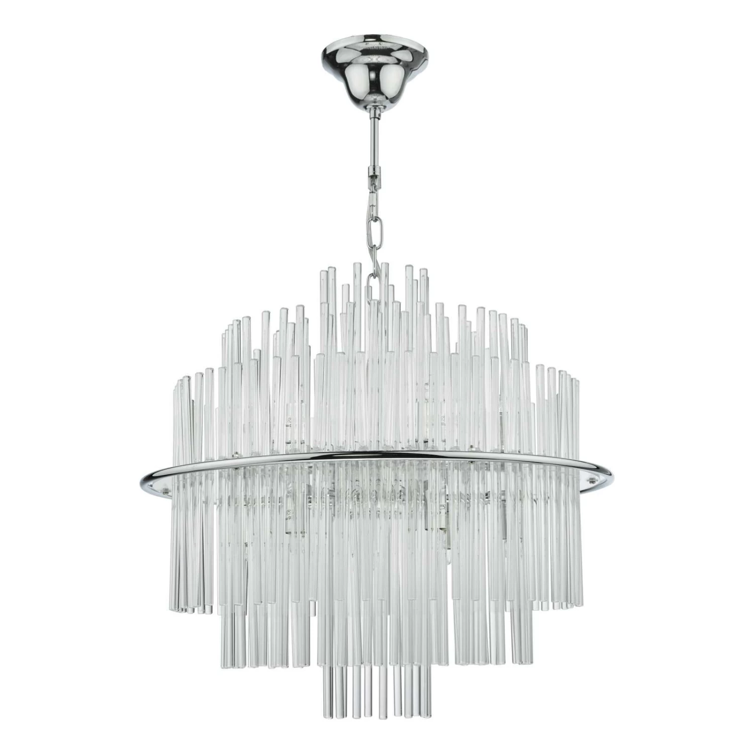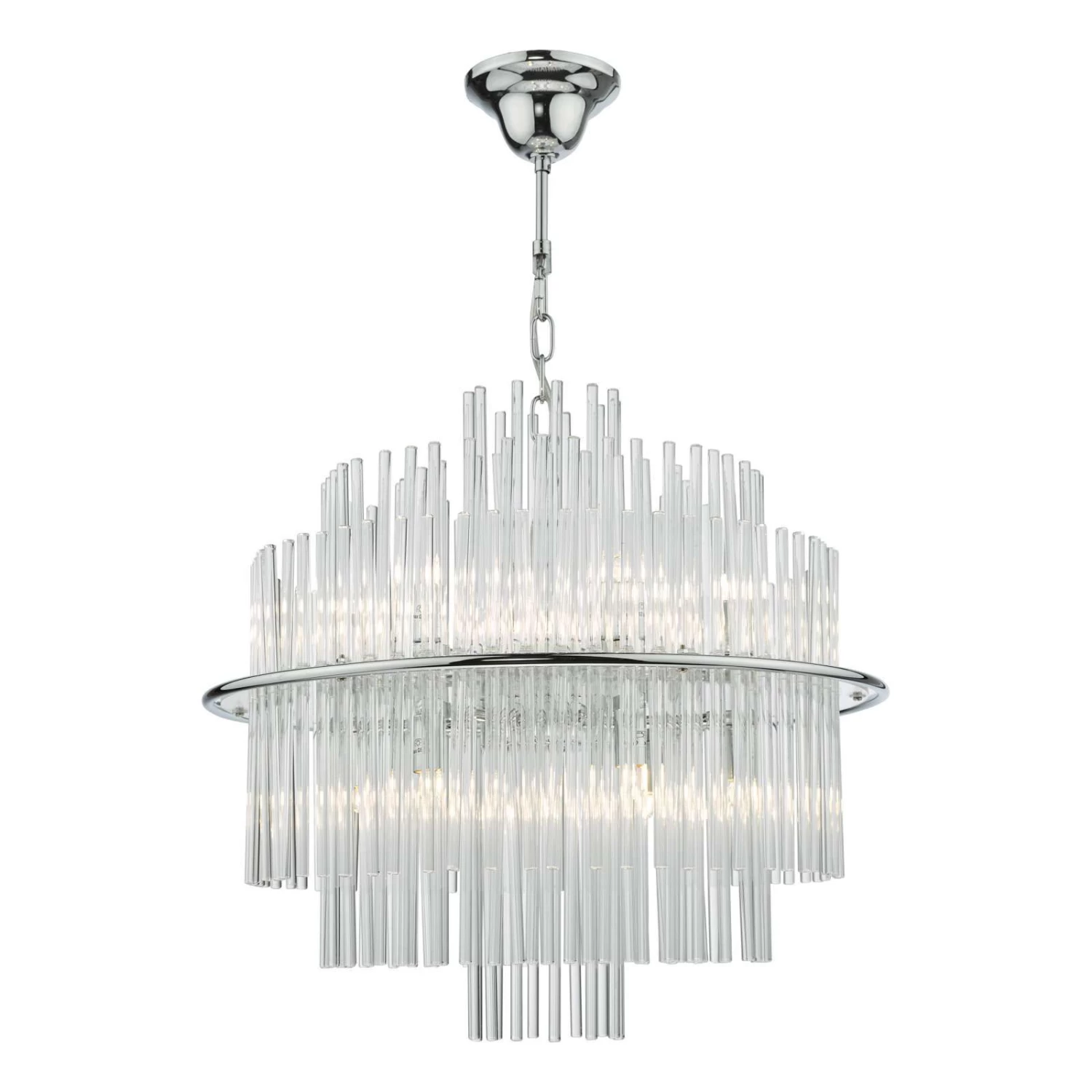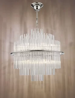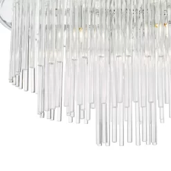 The Lukas 13 light Pendant in polished chrome consists of hundreds of tiered glass rods appearing to give a floating illusion inside a polished chrome band. This fitting is height adjustable and would make the perfect statement piece for any living area.