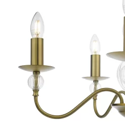 The Lyzette 5 light pendant is a contemporary take on a traditional armed fitting, featuring modern hand blown waterfall glass on aged brass metal work, fitted with 1m of chain which is adjustable on installation. This 5 light pendant can be used without a shade or can be fitted with a candle clip shade (sold separately