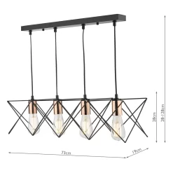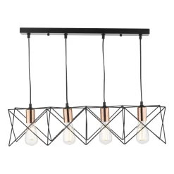 The geometric Midi 4 light over-table bar pendant features a compact square wirework, powder-coated in matt black forming a cage for showing off 4 bright, polished copper lamp holders. This neat bar pendant light brings a touch of the industrial look yet remains fresh and contemporary in its Scandi styling. Perfect for displaying decorative bulbs, with the open metalwork frames this fitting adds ambience to vintage and modern interiors alike.
