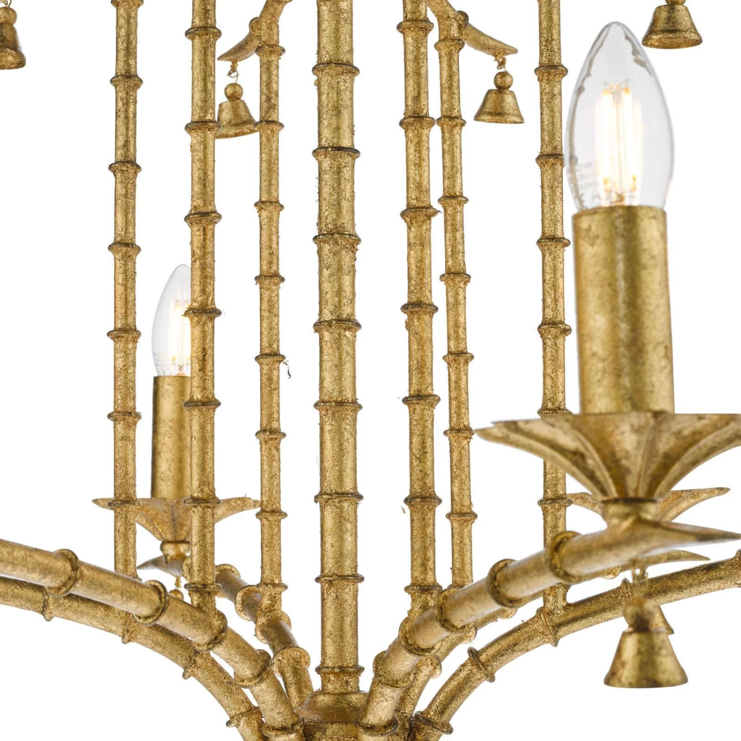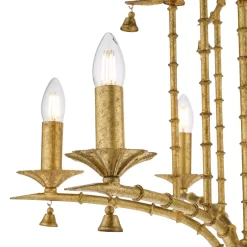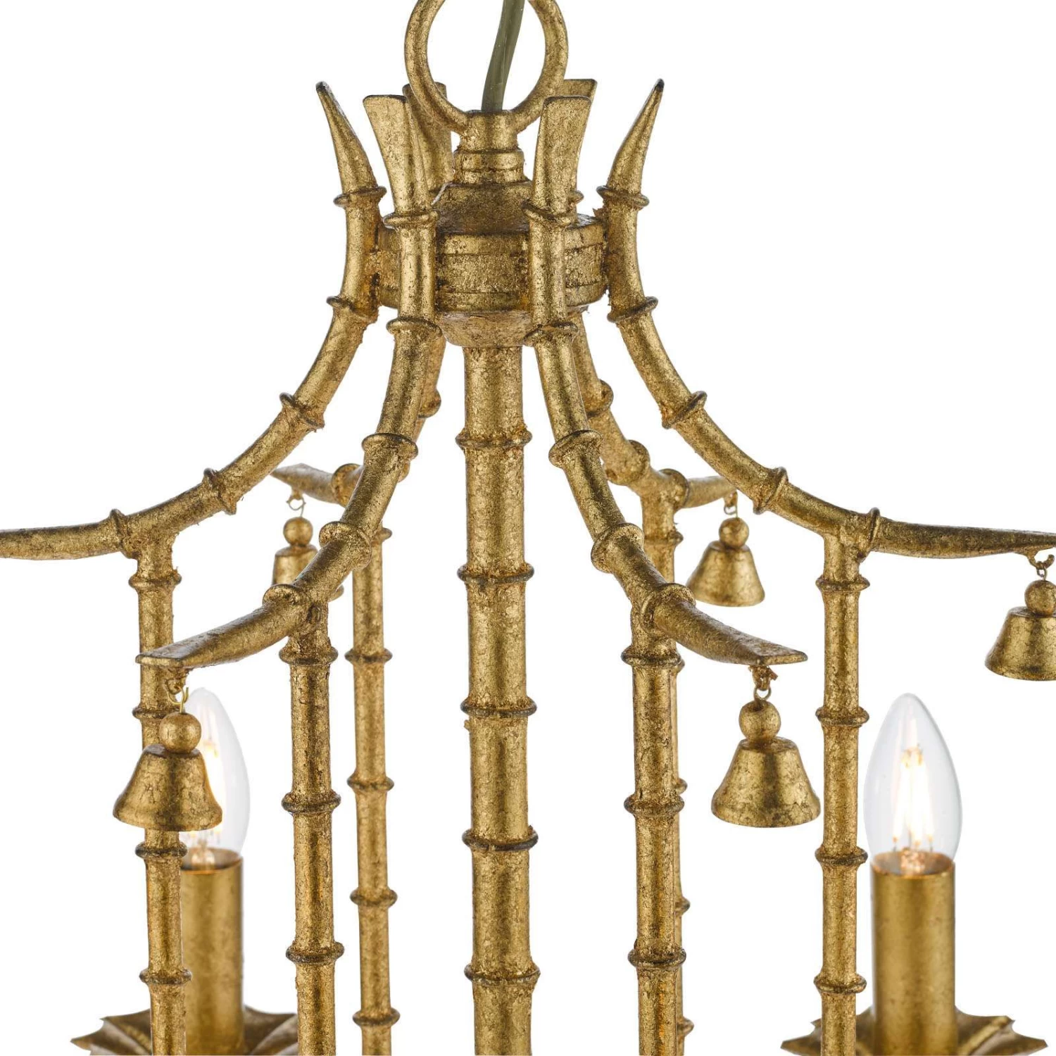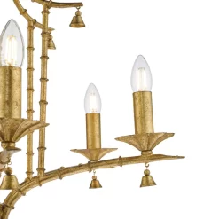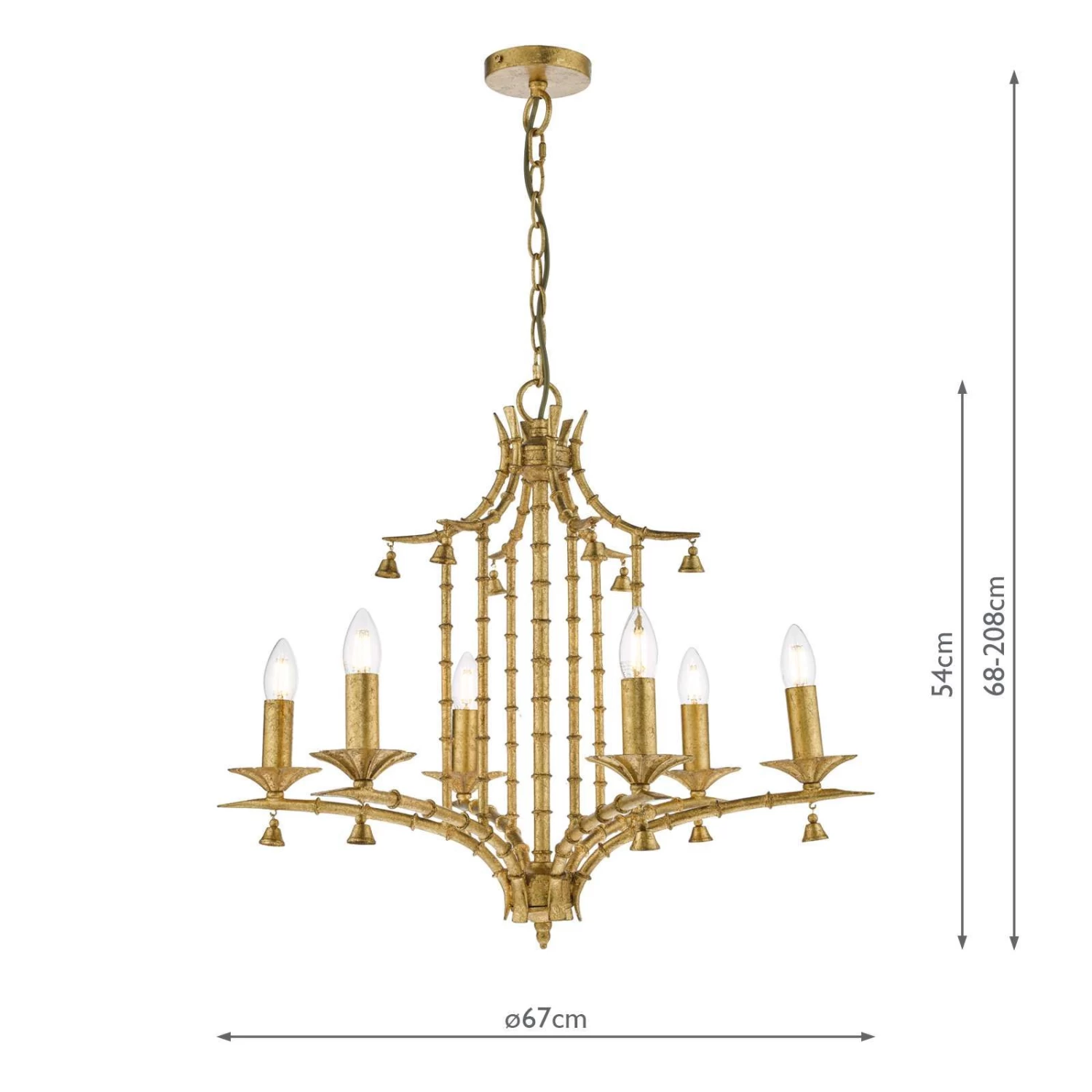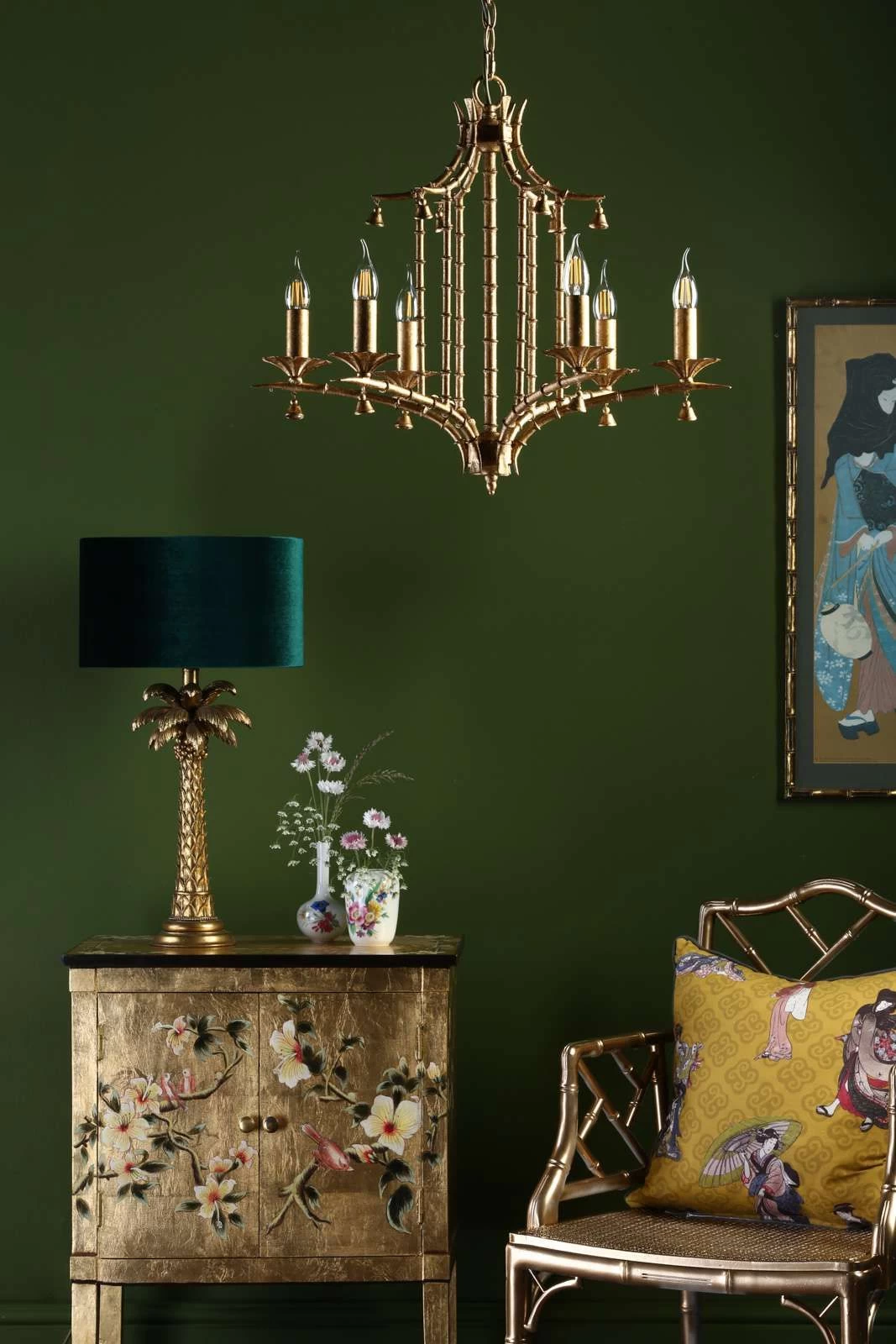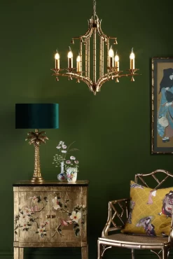 The Miette 6 light chinoiserie chandelier hand made and hand finished in gold effect leaf, the faux bamboo frame complements the pagoda style shape. All referencing the original late 17th Century trend where East meets West. The Miette chandelier will make a great statement piece on itβs own or work well in any maximalist interior. Supplied with 1.5 metre of matching chain and gold cable that can be adjusted on installation. It can be used with bare lamps or softened with our clip on shades.