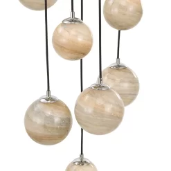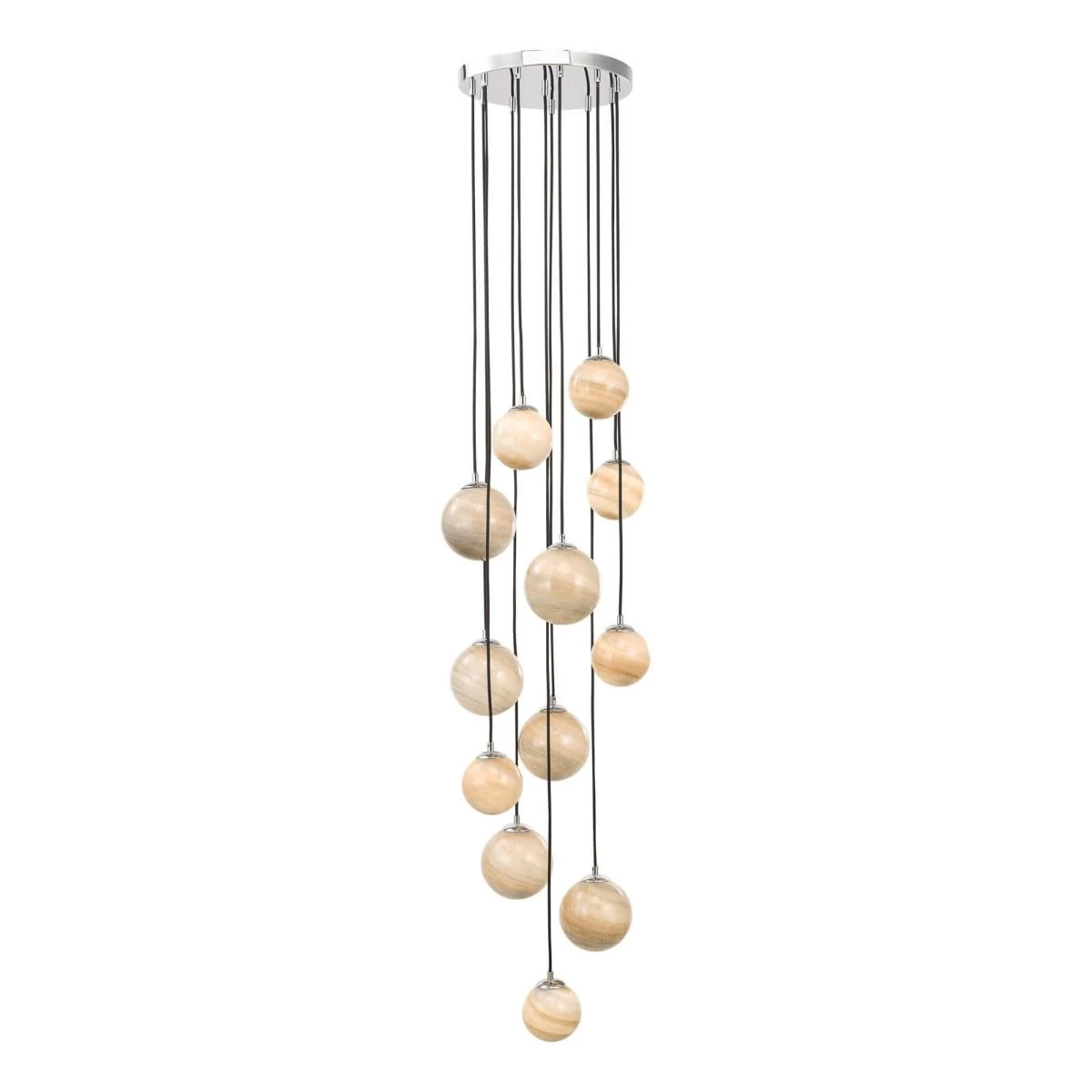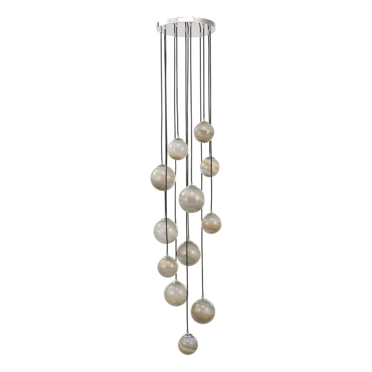 Transform your space with the Mikara 12 Light Cluster Pendant. Hand-blown glass shades inspired by the planets create an enchanting look, each displaying a unique swirl of blue and orange hues, with polished chrome detailing.