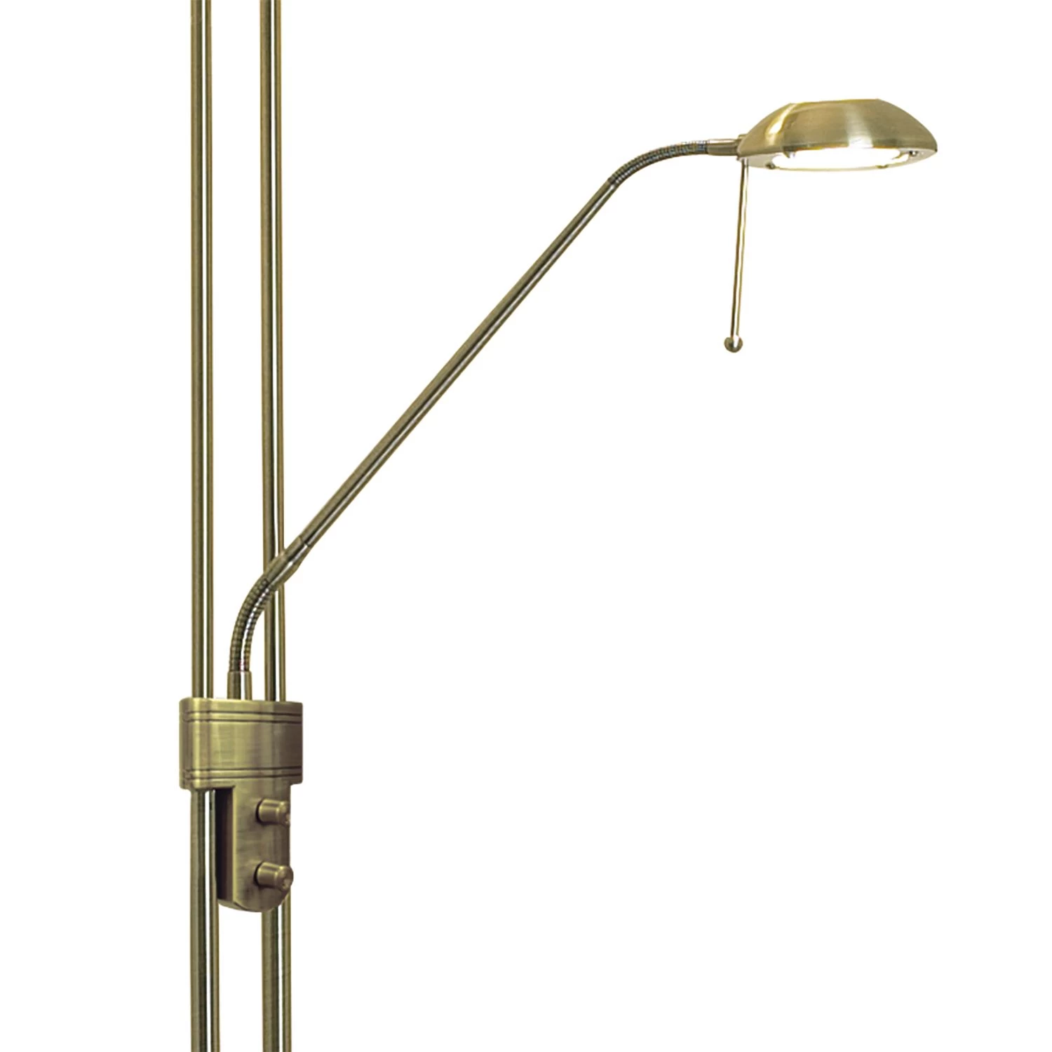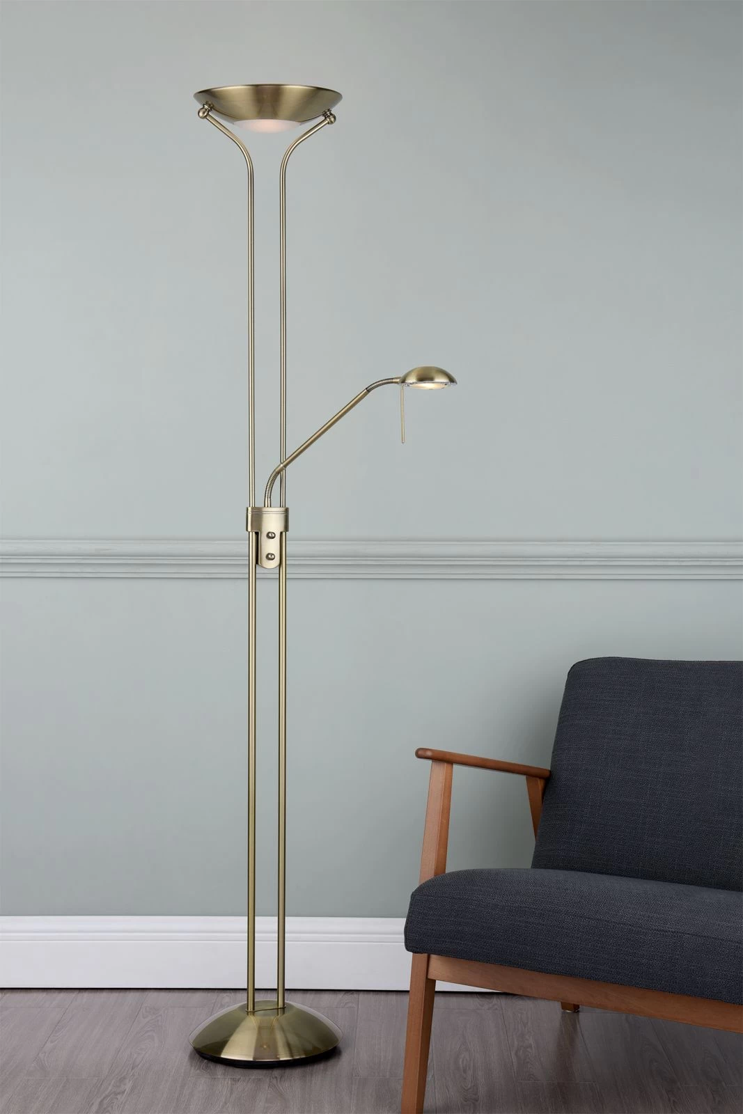 Strong and sturdy, the MONTANA Floor Lamp is finished in antique brass and features a dimmable uplighter and dimmable, adjustable reading lamp.