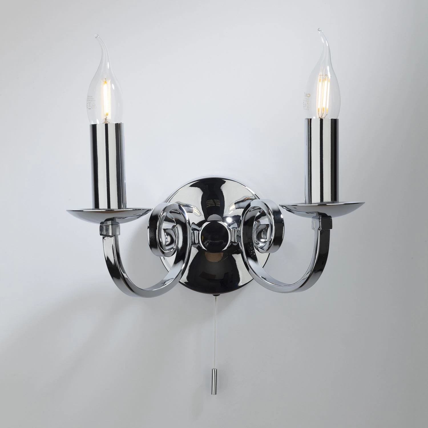 The wall light is operated by a pull cord.