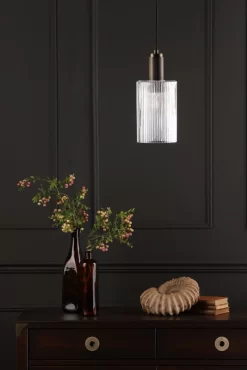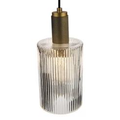 The Nikolas single pendant is a perfect example of the refined industrial style, inspired by industrial lighting using a rich pallet of materials and finishes. Featuring a wonderfully heavy machined lamp holder with a contemporary single knurling and an aged brass finish. Finished with a ribbed glass globe shade.