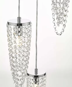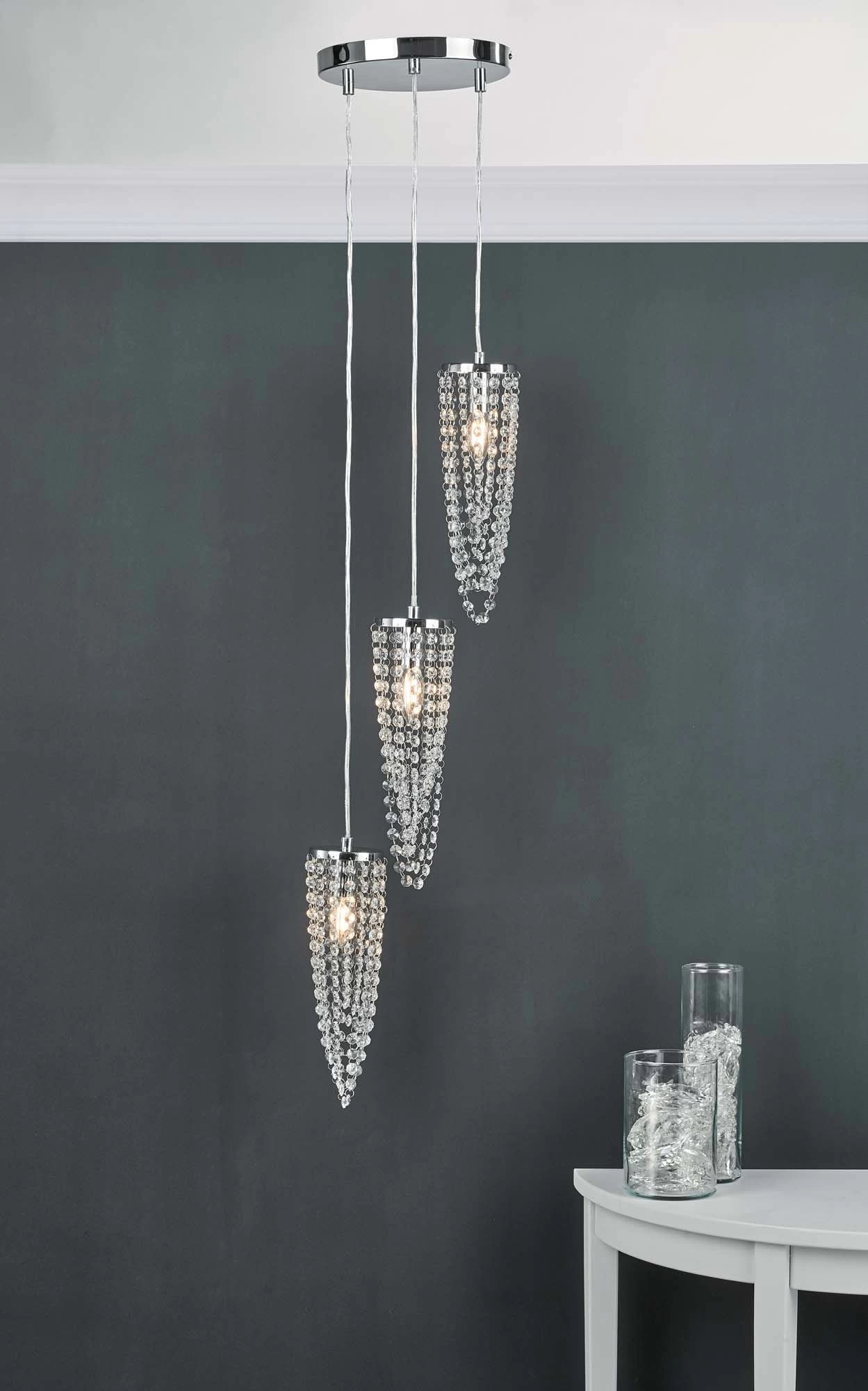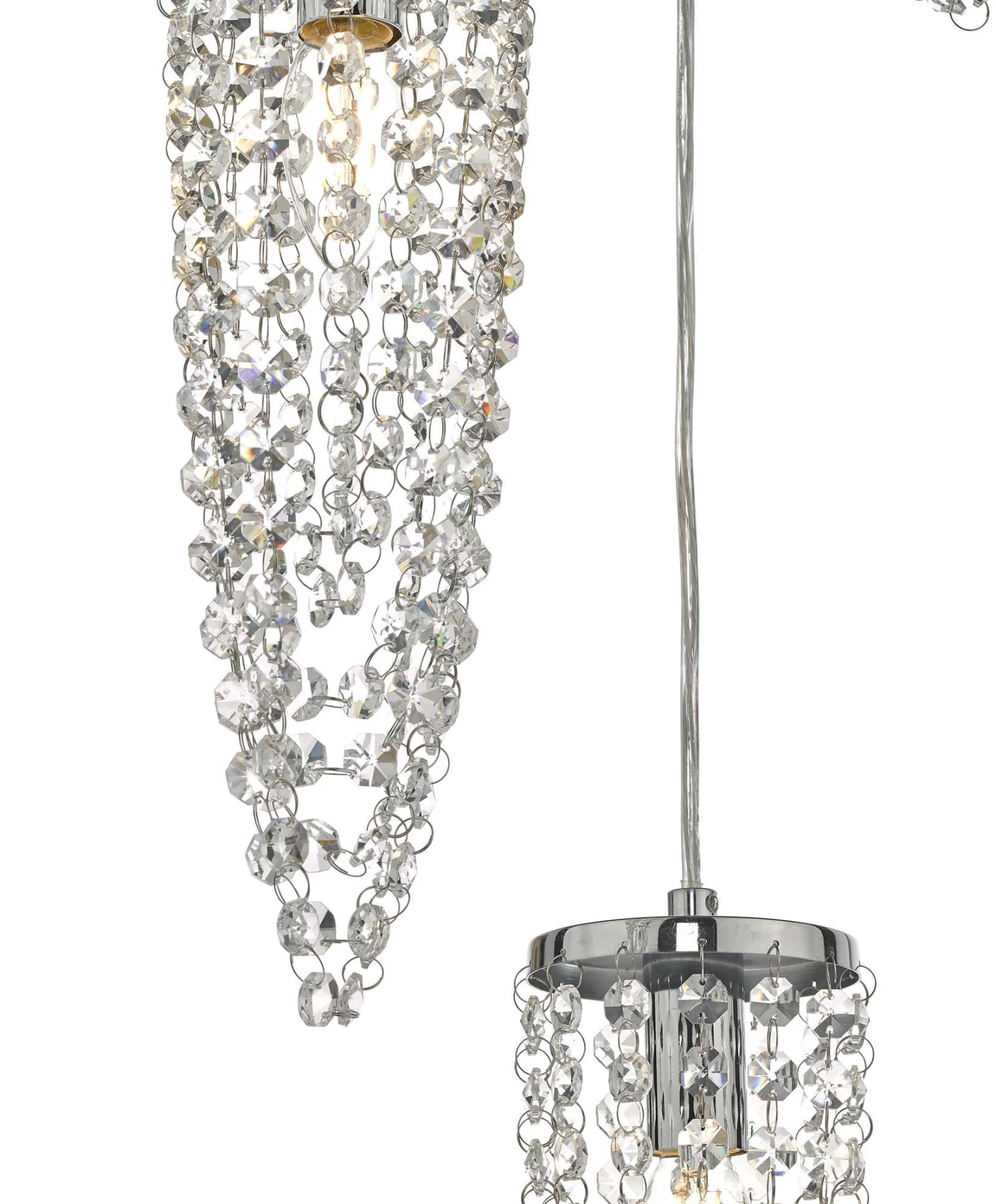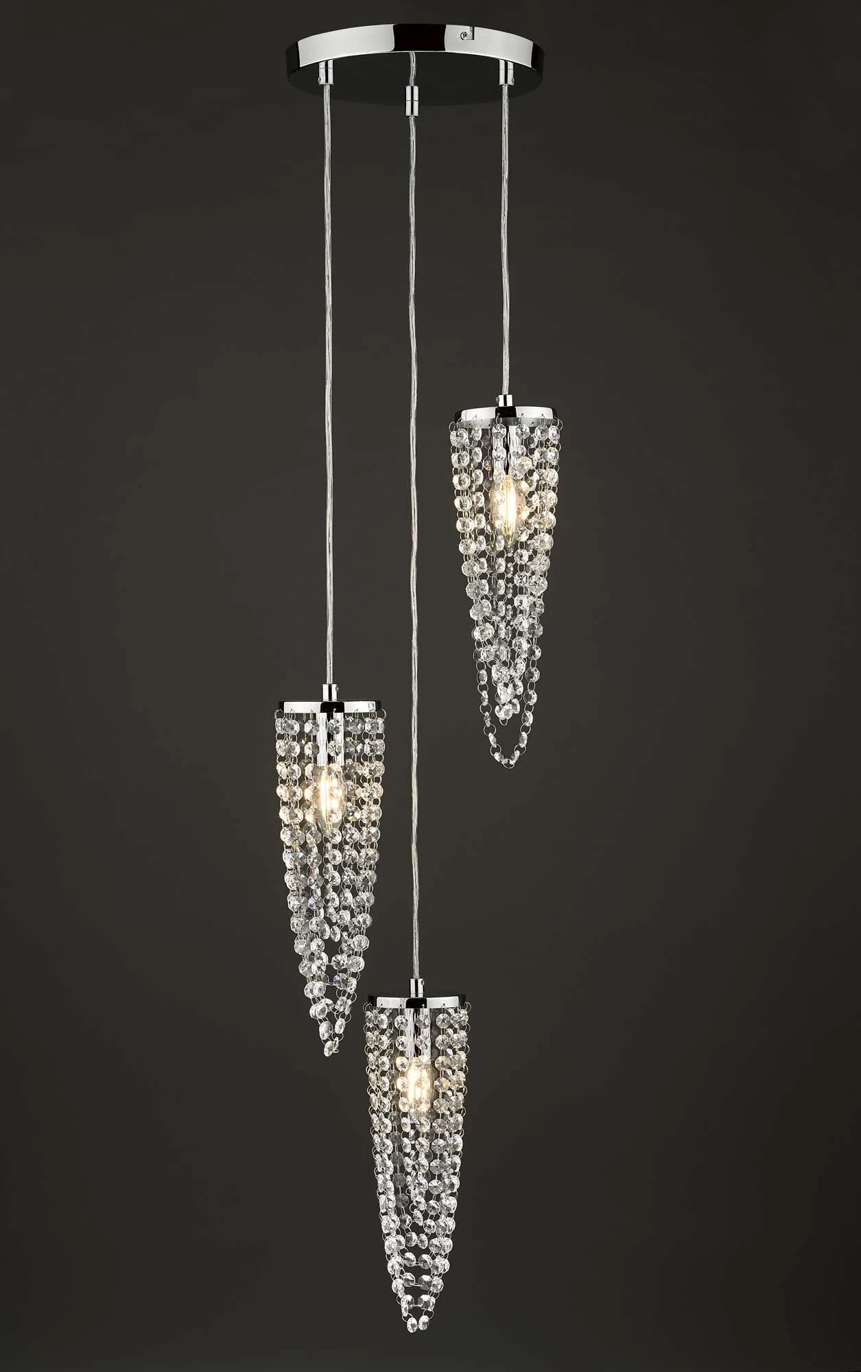 The Nuala 3 light Cluster Pendant NUA0350 is a cluster of 3 lamps adorned with swathes of high quality crystal in a polished chrome finish. The perfect statement piece for a hall or stairway.