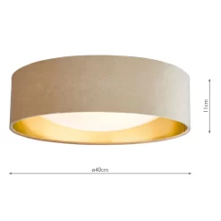 The medium 2 light Nysa flush ceiling light with a taupe velvet shade, gold lining and polycarbonate diffuser offers a bright even non glaring light with the addition of a velvet shade to offer more luxurious look for a flush light.
