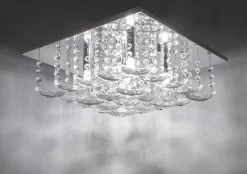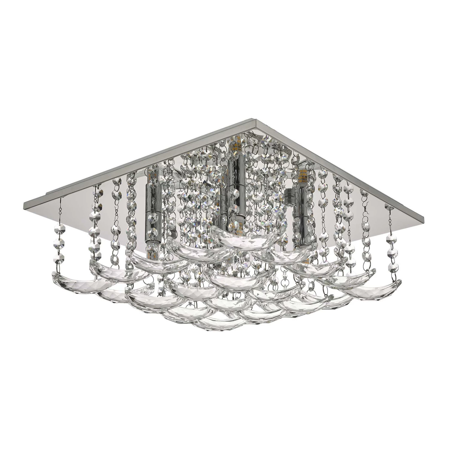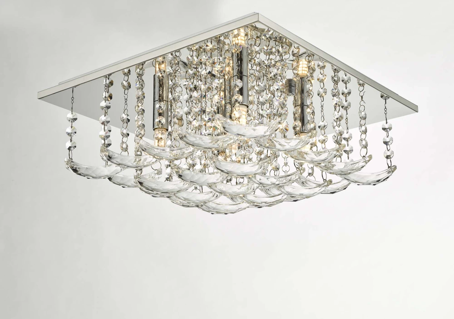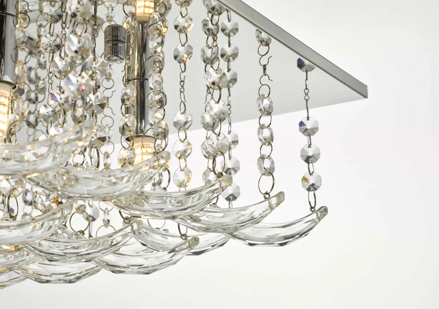 The Orella 5 Light Flush Polished Chrome & Crystal ORE5450 is a curved faceted crystal flush fitting suspended in a perfect square giving a stunning lighting effect, finished in polished chrome. Available in a larger size.