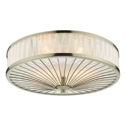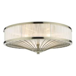 The Oslo 3 light flush fitting is a feminine ceiling light, with an undercarriage of antique brass spokes softened by a white glass border wrapped in sheer, faux organza ribbon in ivory, all set within an antique brass finished, wheel-like frame. Internally, the ribbons rise to form a tent, echoing the spokes beneath.