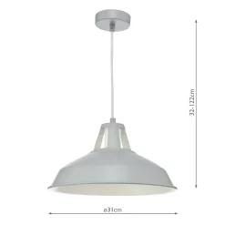 The OWAIN 1 light pendant ceiling light is a spun metal pendant finished in a soft matt grey with a cream inner surface suspended from a grey ceiling plate by luxury grey braided cable. This 31cm diameter single light pendant is height adjustable on installation. It is of a size that makes it suitable for low ceilings.