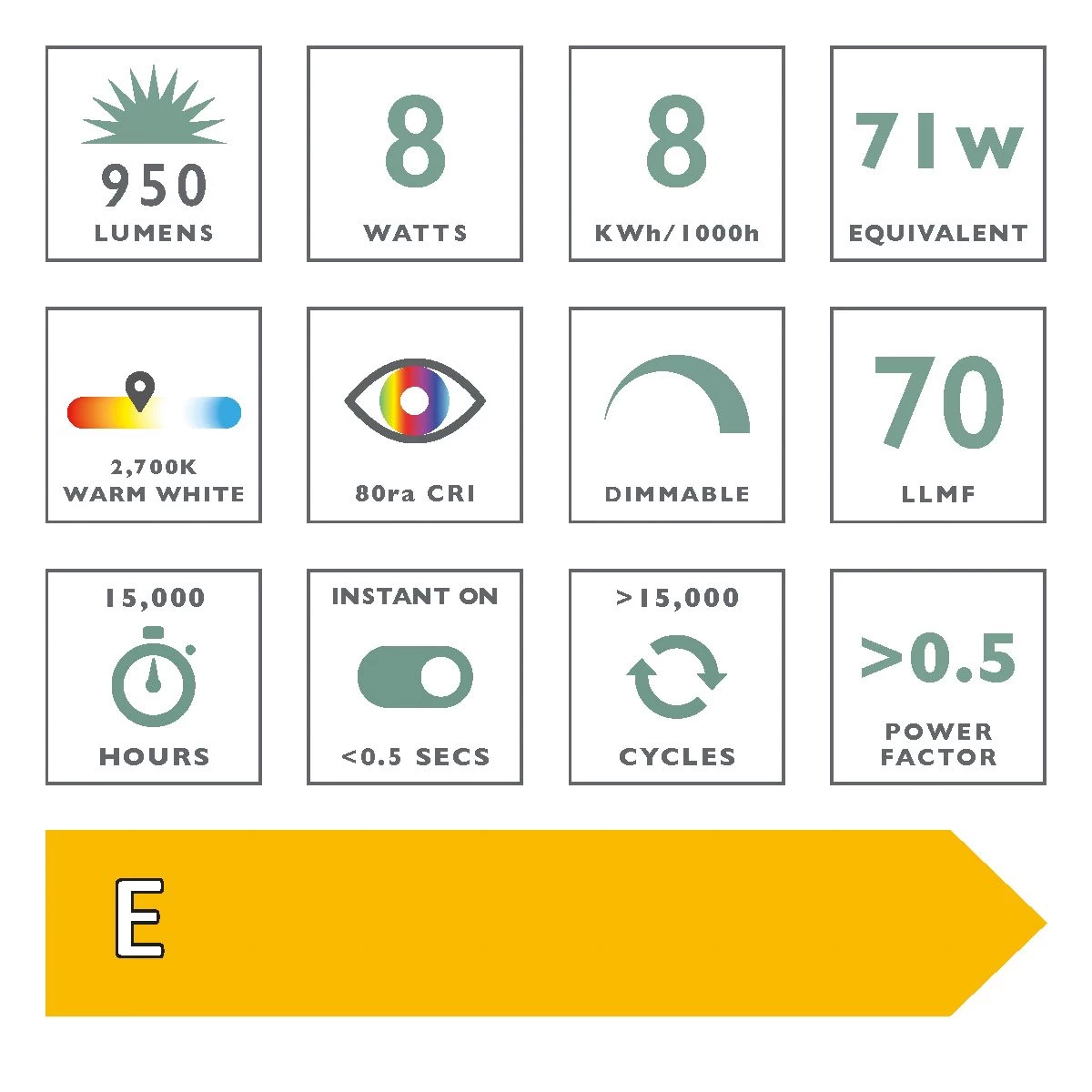 Pack of 5, Dimmable LED GLS Light Bulb (Lamp) ES/E27; 8W; 950 Lumens; 2700k Warm White; Clear Glass
