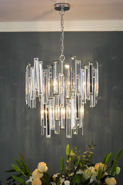 PENELOPE – a fabulous feature centre piece pendant with gorgeous clear crystal lozenges set in a polished chrome frame. Height adjustable on installation with 6 x G9 lamps this unique fitting adds a splash of glamour to any environment.