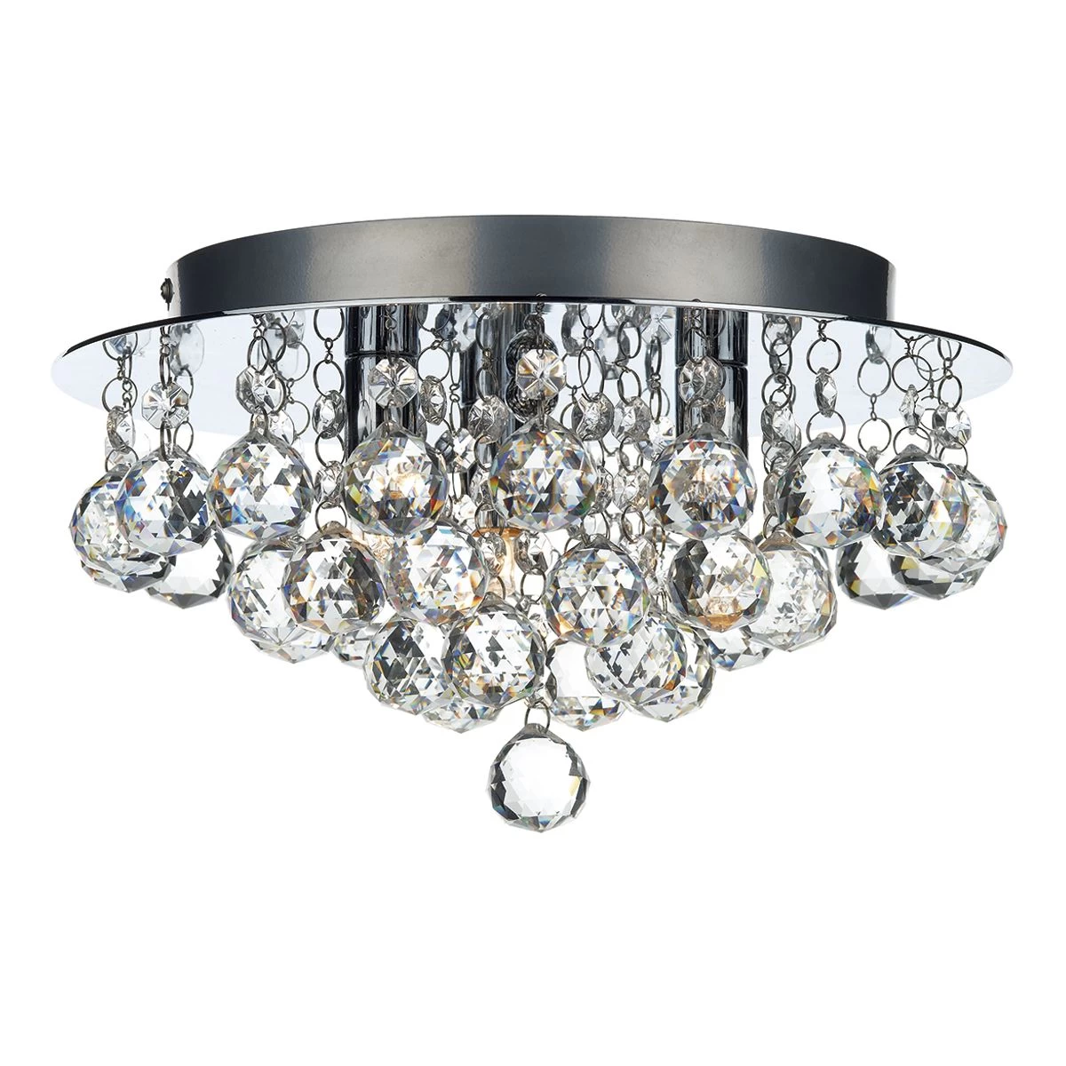 The PLUTO 3lt Flush fitting features rings of faceted crystal drops and a polished chrome ceiling plate. Comes fully assembled.