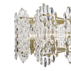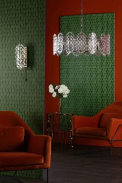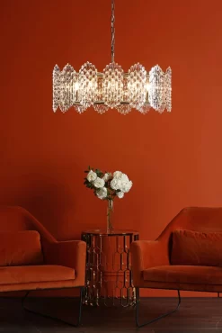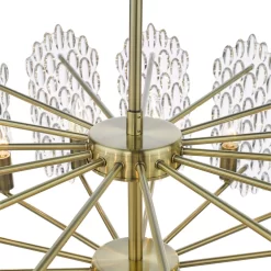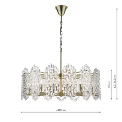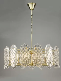 The Porthos 15 light pendant is beautiful arrangement of textured glass with elongated lenses gives a unique effect to this large yet shallow chandelier. The natural brass frame is elegant when viewed from below, whilst the low profile of the fitting combined with two metres of adjustable chain allows the Porthos to be used in most situations.