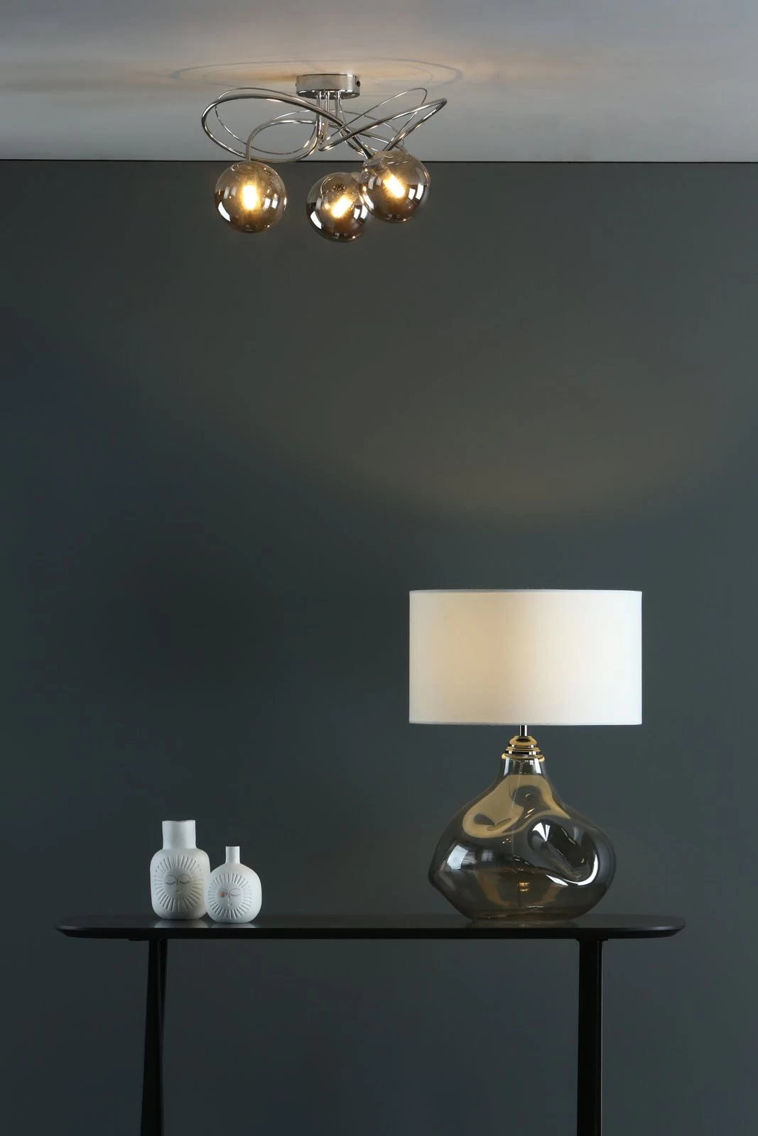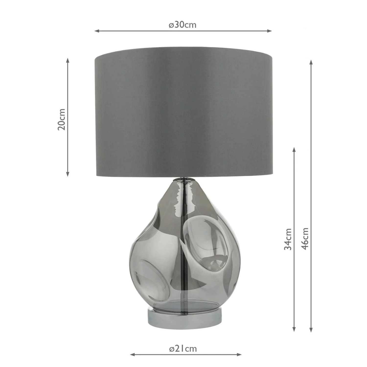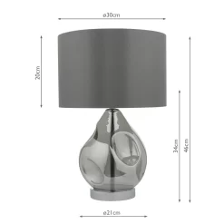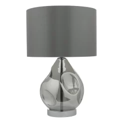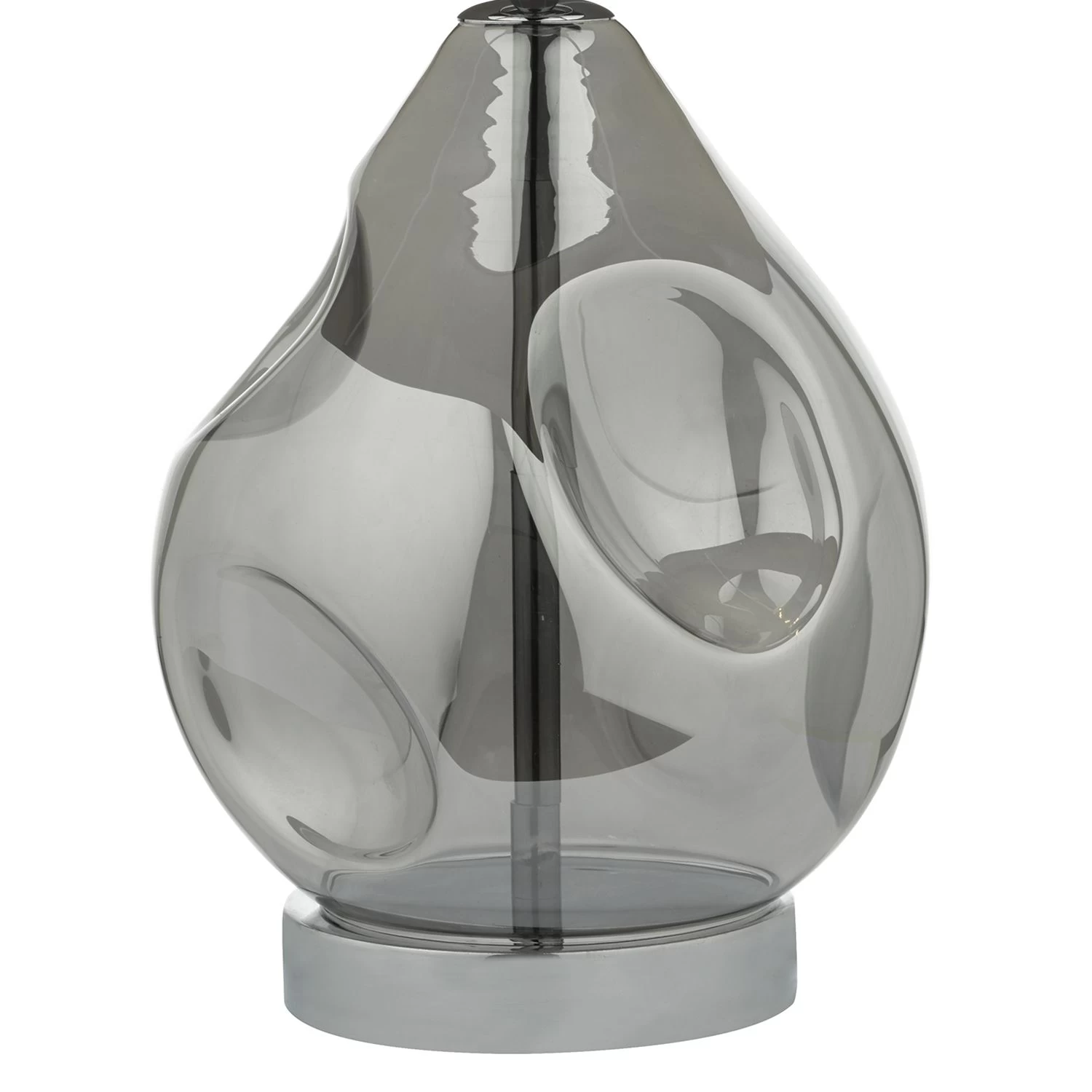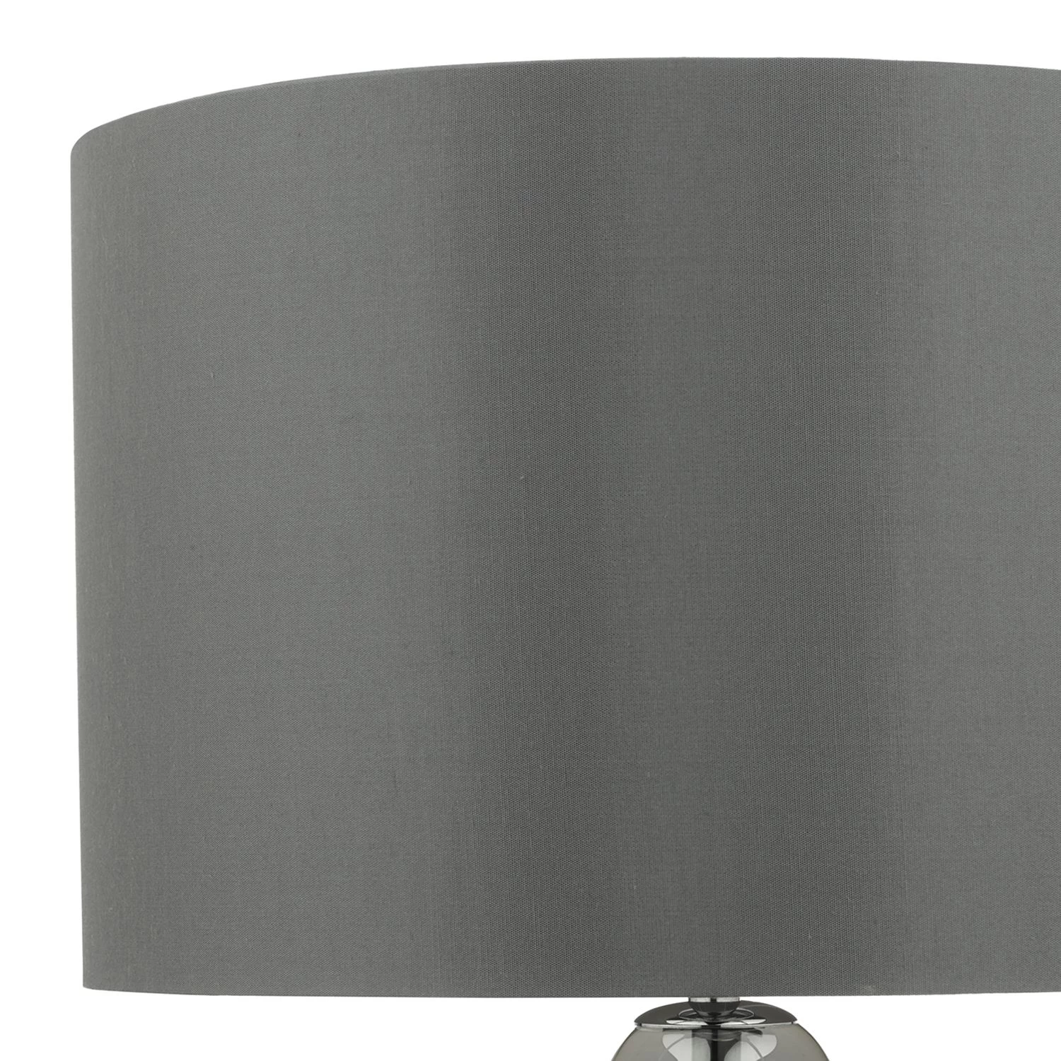 The QUINN table light pendant has an organically shaped, mouth-blown spherical glass base with oversized dimples, in a lightly smoked finish. Paired with bright polished chrome finish metalwork and a sheened fabric shade in grey, this is a unique and striking table lamp that looks great from every angle.