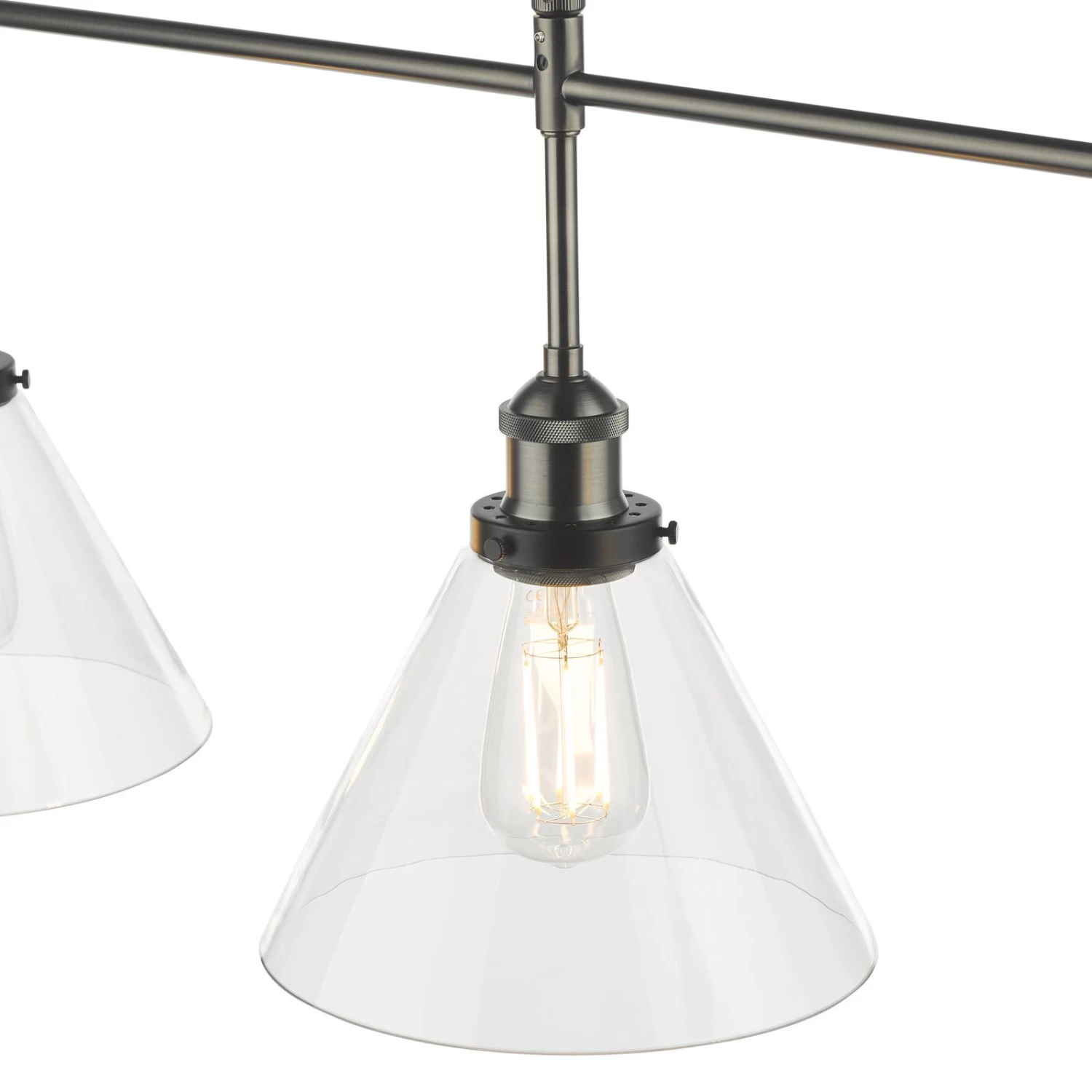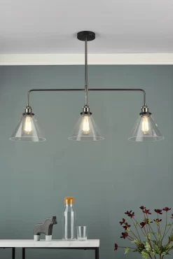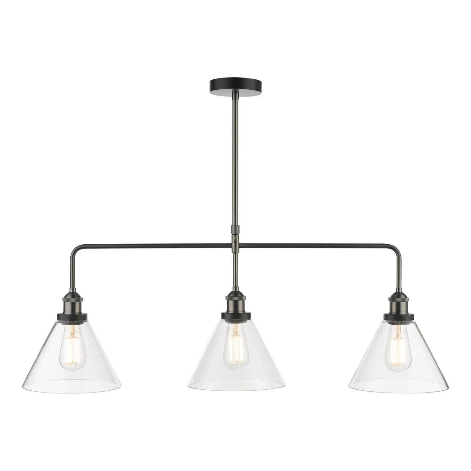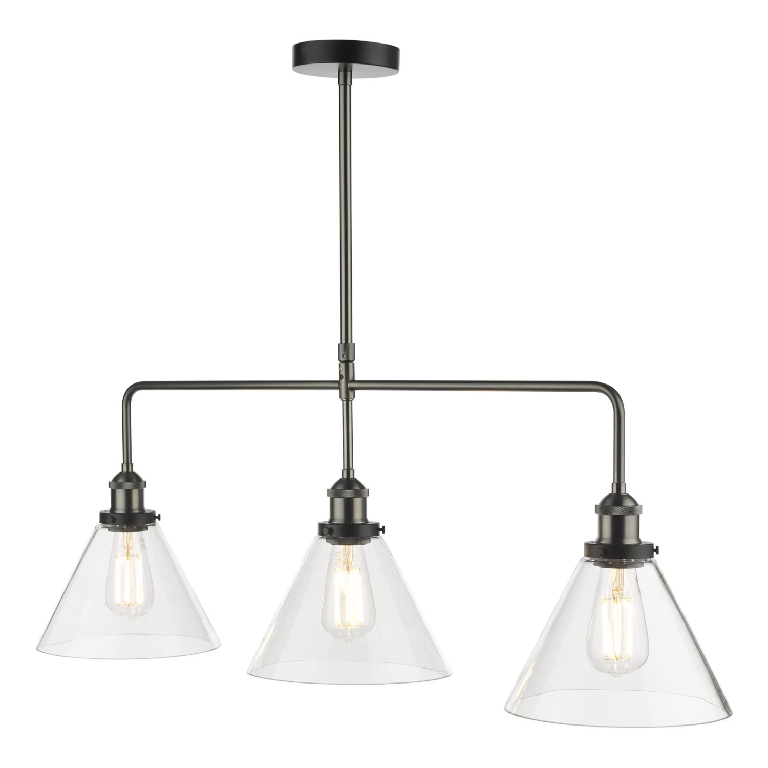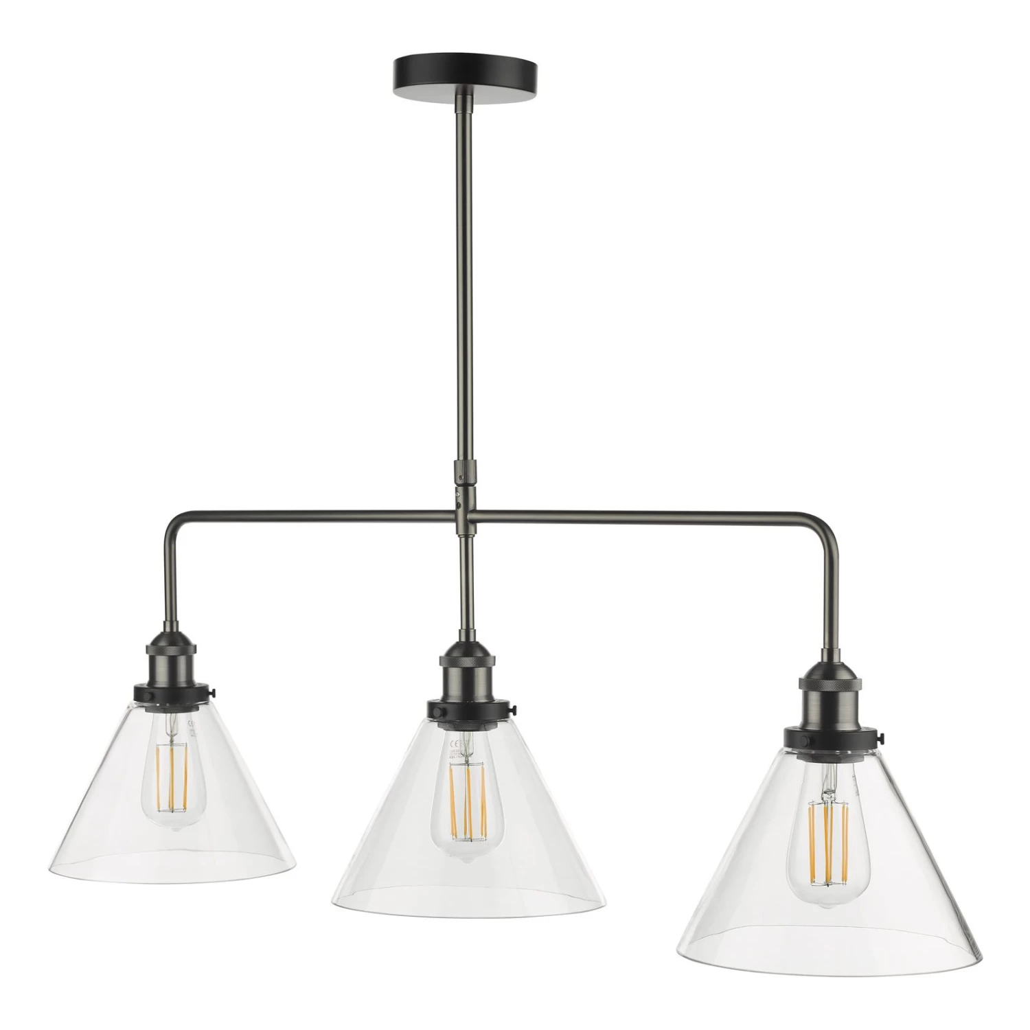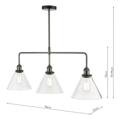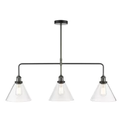 The Ray triple light pendant offers up the industrial style, combining antique nickel metalwork with matt black detail and a conical clear glass shade that can showcase decorative light bulbs; the Ray looks great when teamed with vintage bulbs as pictured. Equally at home in a vintage or modern setting, especially over a kitchen island or dining table.