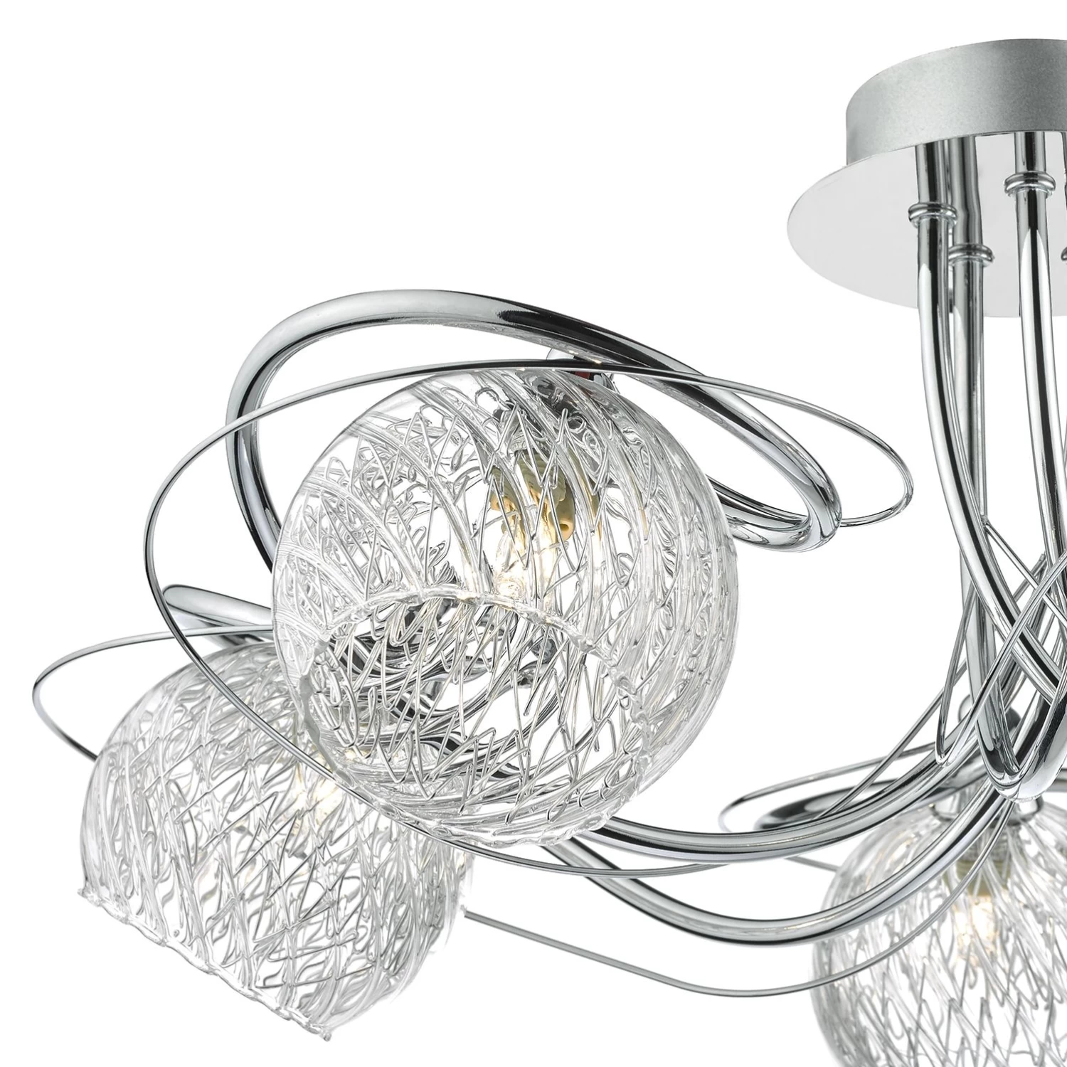 REHAN – is a compact modern style ceiling fitting with 5 x G9 lamp holders set in a delicate clear ripple glass shade with decorative wire inserts to create a beautiful lighting effect. Ideal for low ceilings this light gives out a great sparkle.