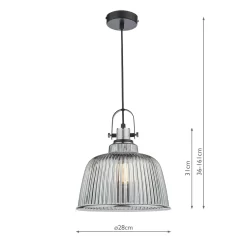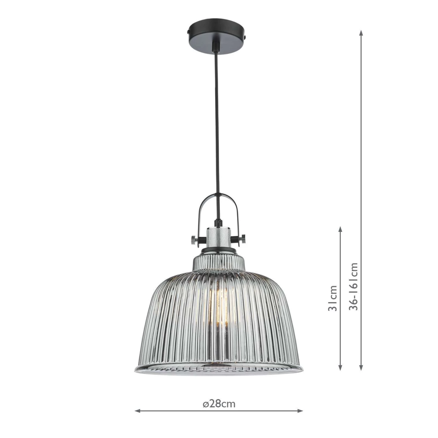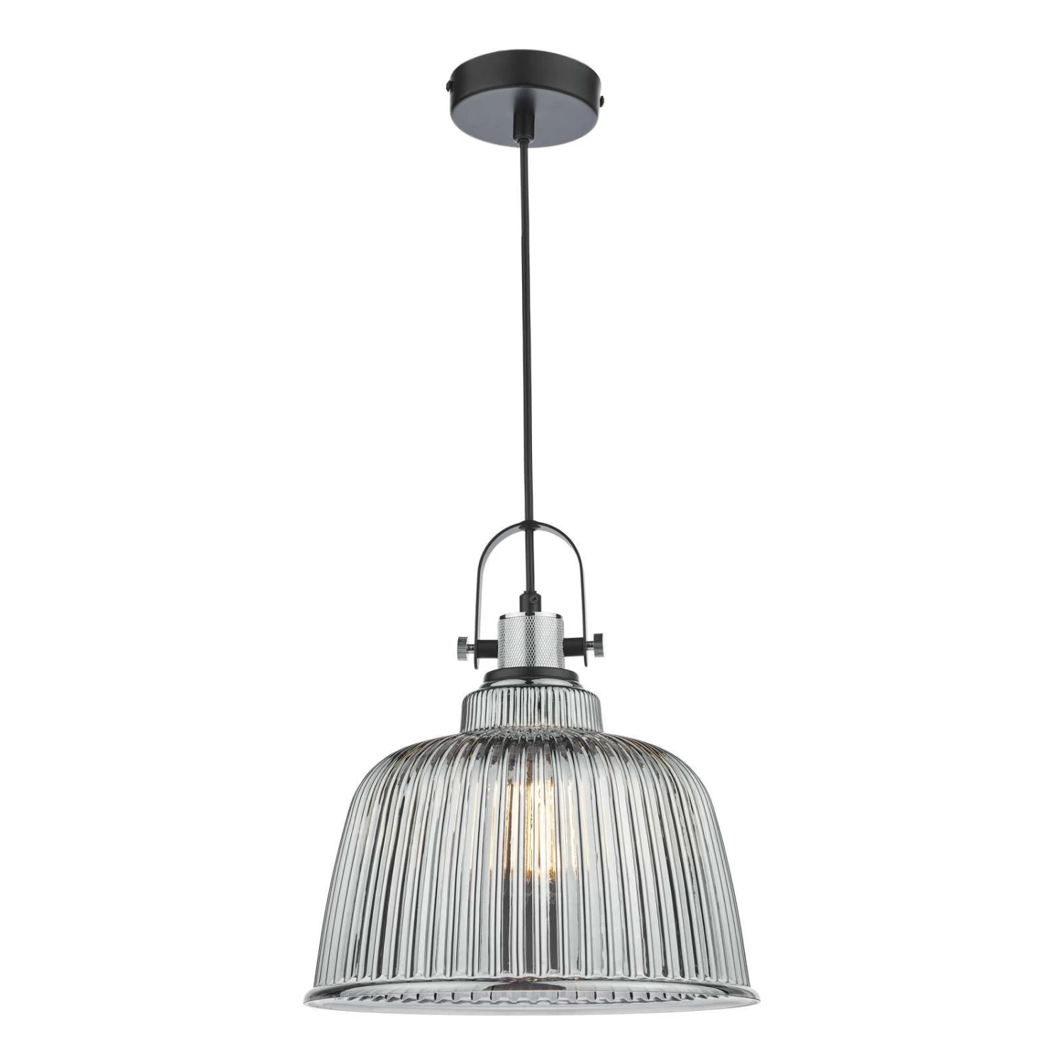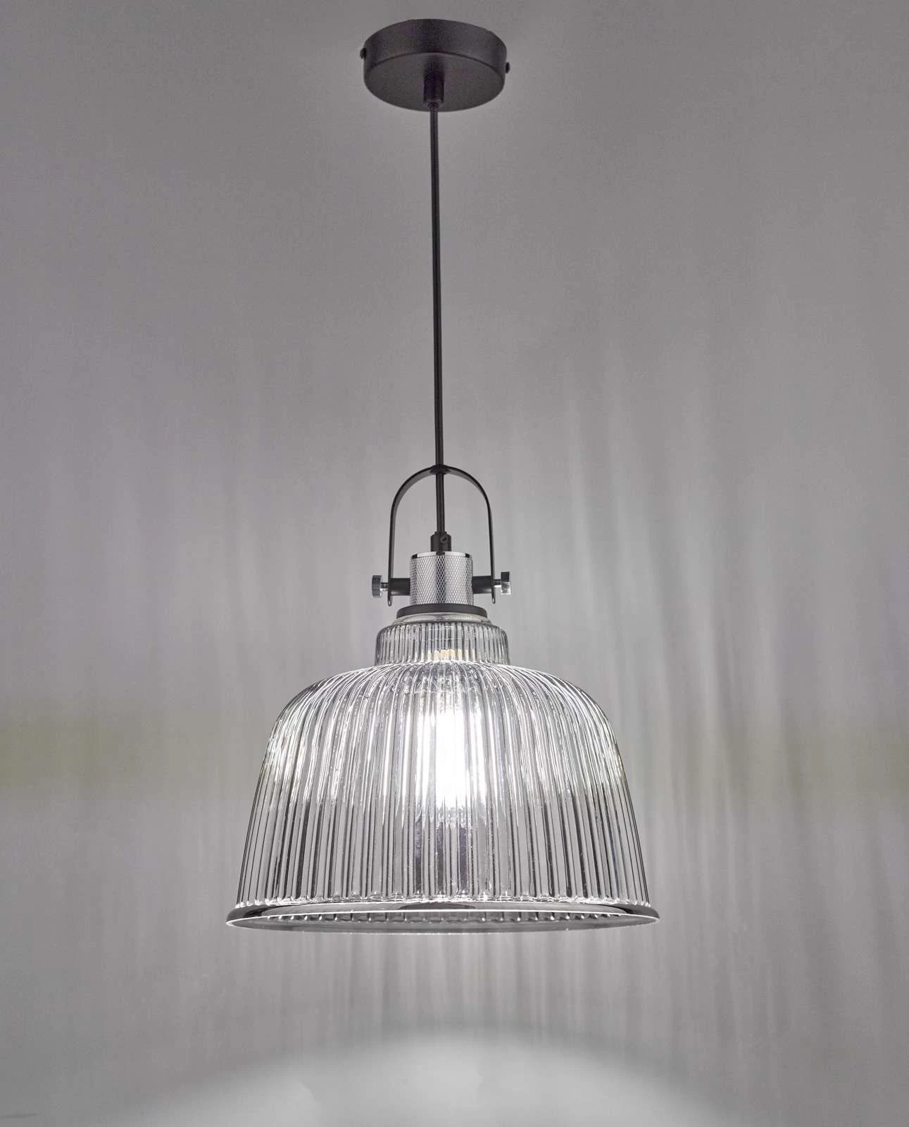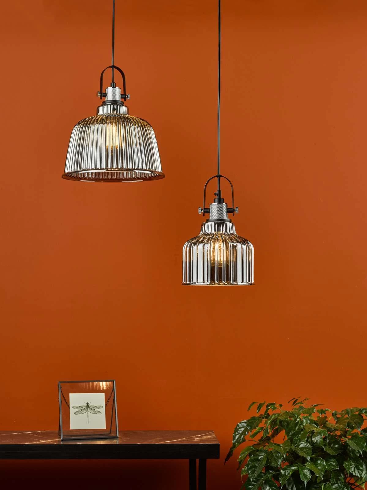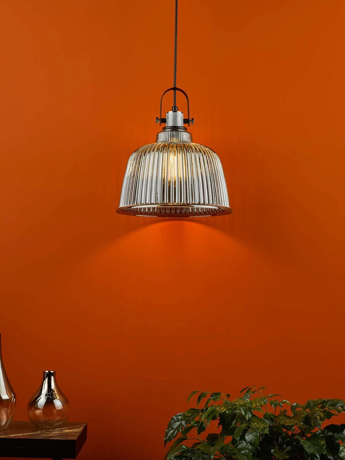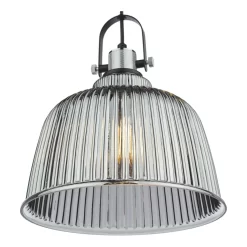 The Rhode single large pendant is a contemporary take on the industrial pendant style. The plated glass gives a sharp mirror effect on a ribbed glass that gently diffusers the light. Complemented by a knurled aluminium lamp holder. The combination of high quality materials makes a more glamorous cross over look than the typical industrial pendants.
