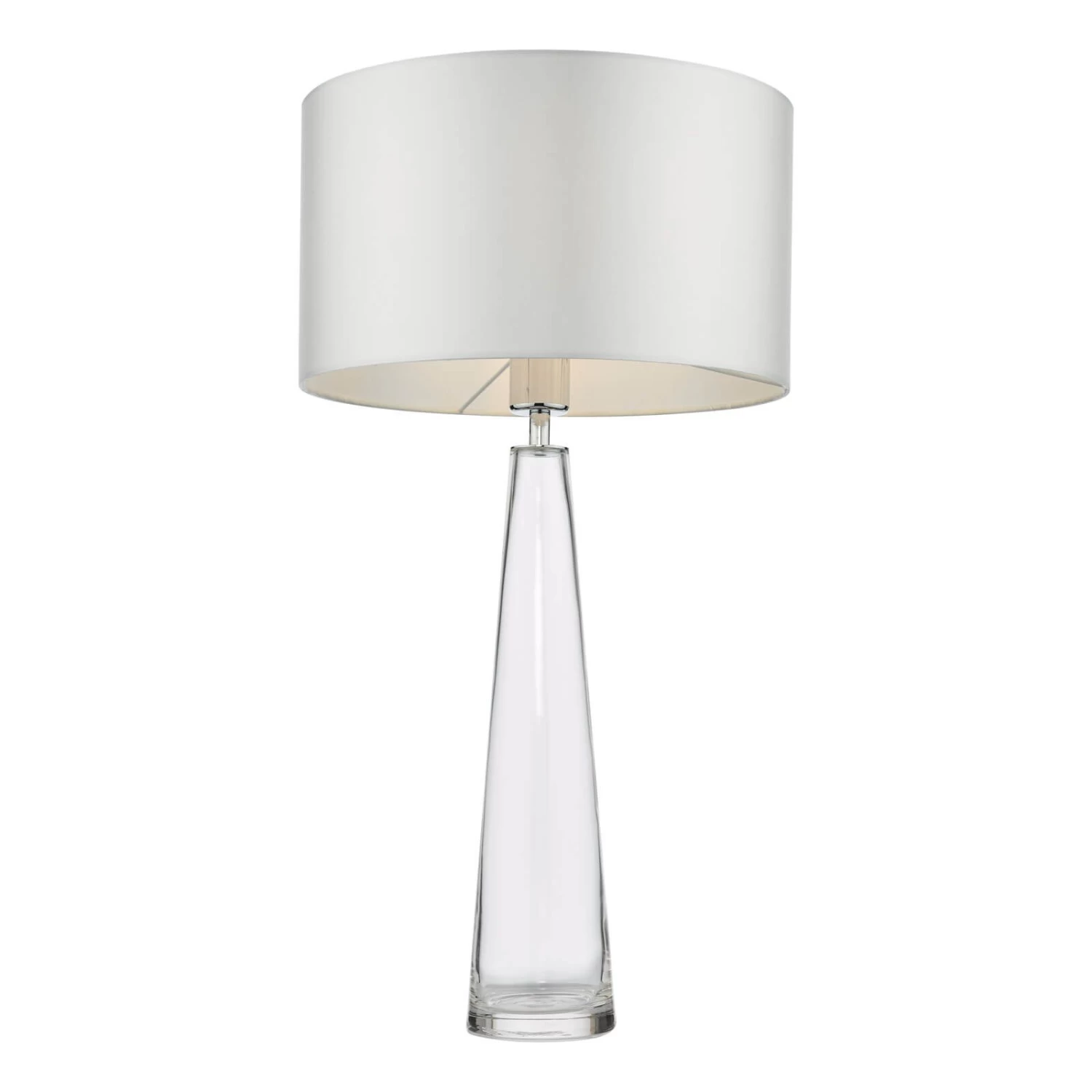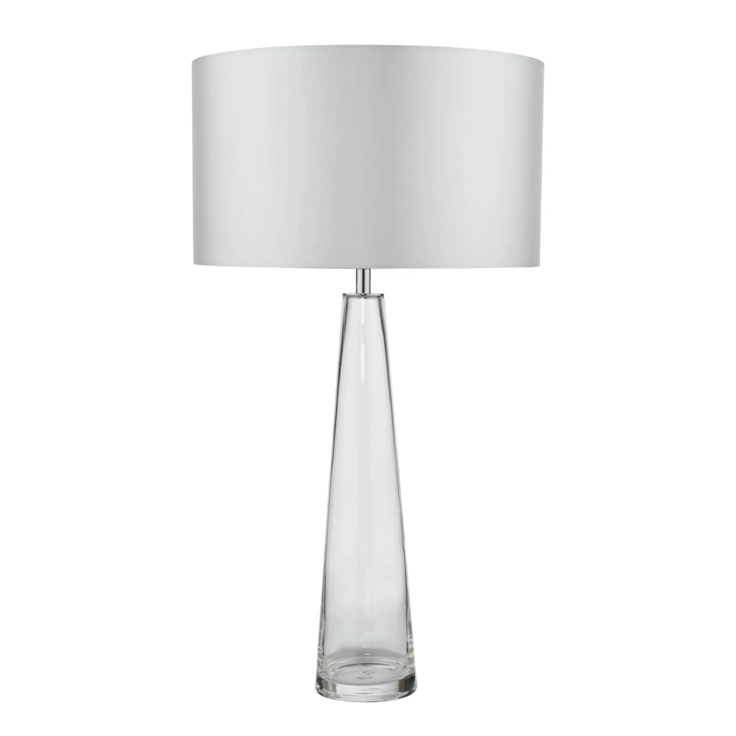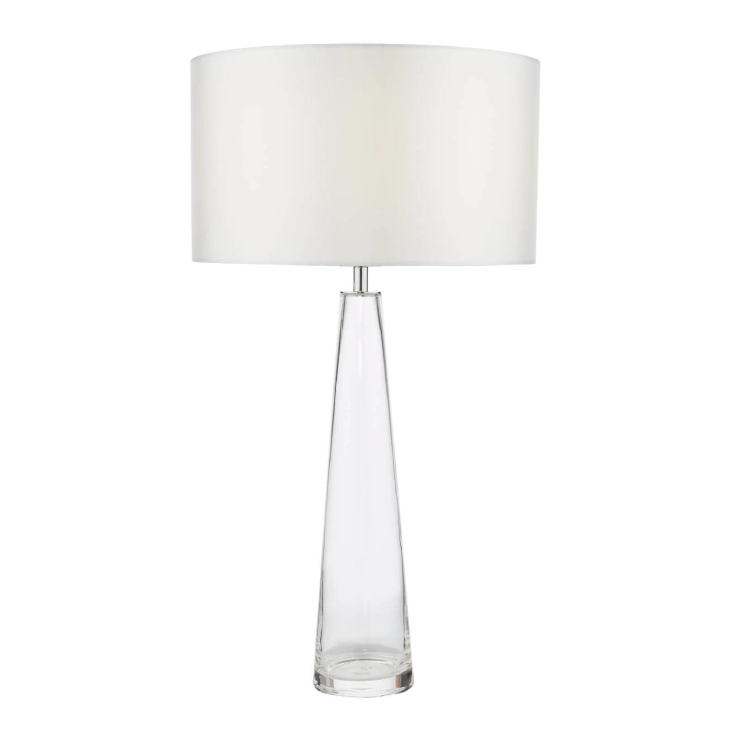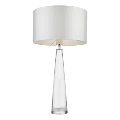 The Samara clear glass table lamp is an elegant tapering hand made glass table lamp with a heavy glass base. Finished with an ivory twisted braided cable and polished chrome metal work.